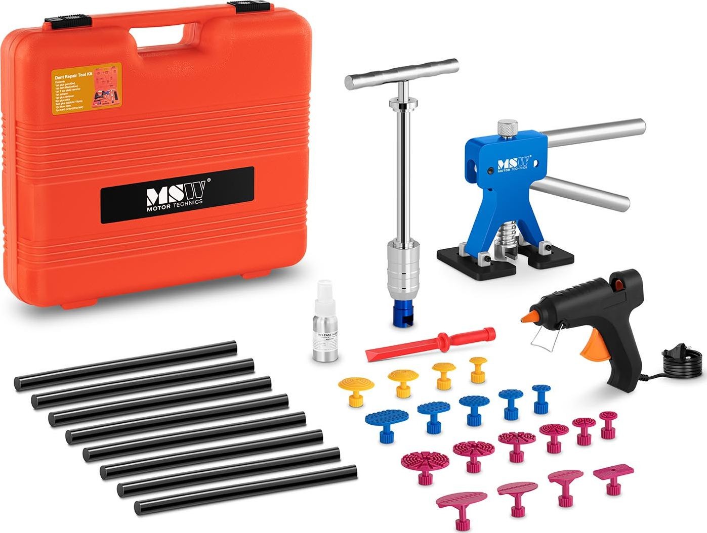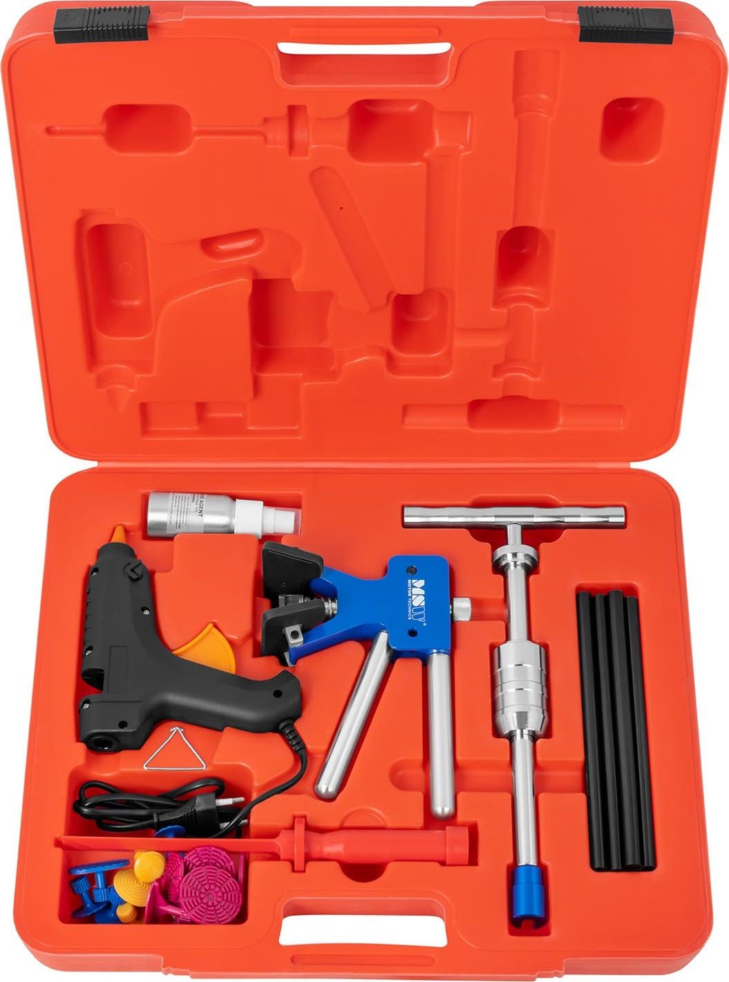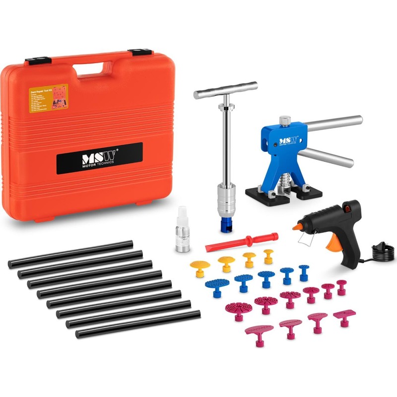 Herstellernummer: MSW 10060796 Das PDR-Reparaturset (PDR = Paintless Dent Repair) zum Entfernen von Dellen an Autokarosserien, Motorrädern oder sogar Waschmaschinen und Kühlschränken ist ein grundlegender Bestandteil der Ausstattung von Karosserie- und Kfz-Werkstätten sowie eine hervorragende Ergänzung für private Garagen oder Heimwerkerwerkstätten. Dank der bequemen und einfachen Handhabung sowie der beiliegenden Bedienungsanleitung eignet es sich sowohl für Profis als auch für Hobbyhandwerker. Das Modell MSW-DENTPULLER.SET2 ermöglicht aufgrund des umfangreichen Sets (33 Teile) das Ausbeulen von Dellen unterschiedlicher Größe und Form. Im Lieferumfang enthalten sind eine leistungsstarke 40-W-Klebepistole (sowie 8 Stück Klebstoff mit hoher Haftkraft), ein Schwunghammer für größere Dellen, Werkzeuge zum Ausbeulen kleiner Dellen und viele weitere Spezialzubehörteile. Die Benutzerfreundlichkeit des Sets zum Entfernen von Beulen in der Karosserie beruht auf einem einfachen Funktionsprinzip und einer ergonomischen Konstruktion. Beim Ausbeulen der verformten Fläche muss der Anwender keine große körperliche Kraft aufwenden, und alle Details zur Arbeit mit dem Werkzeug sind in der Anleitung genau beschrieben. Darüber hinaus können der Anwender und der Kunde durch den Einsatz des Profi-Sets sowohl Zeit als auch Geld sparen. Die Zeit- und Geldersparnis ergibt sich aus dem fehlenden Risiko einer Lackbeschädigung. Die Karosserie muss weder geschliffen, gespachtelt noch neu lackiert werden, und die Reparatur selbst kann in nur einer halben Stunde erledigt sein! Darüber hinaus steigen die Reparaturkosten durch den Einsatz von PDR-Werkzeugen nicht an, was den Kunden sicherlich zu weiteren Besuchen im Falle eines Unfalls motivieren wird. Produkteigenschaften