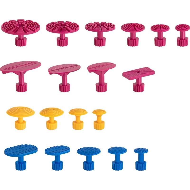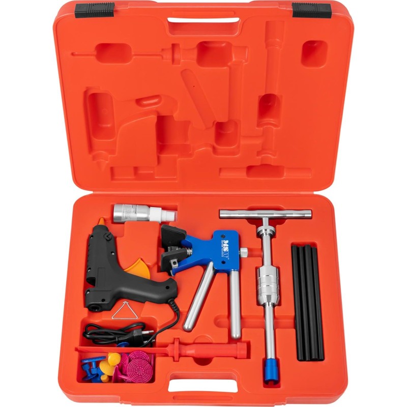 :- Ausbeulgerät (Puller) mit Hebel - Trägheitshammer - Klebepistole - Köpfe (Adapter) zum Ausbeulen – 19 Stück - Klebestifte – 8 Stück - Flasche für Klebstoffentferner (leer) - Meißel zum Entfernen von Klebstoff - Koffer - Anleitung (PL)