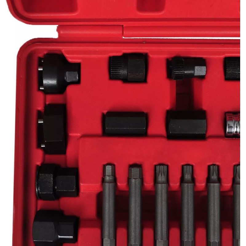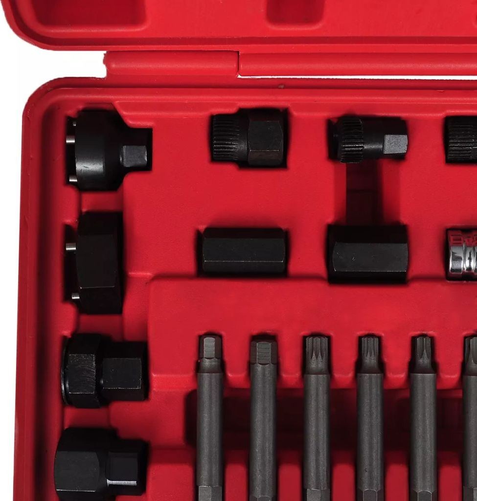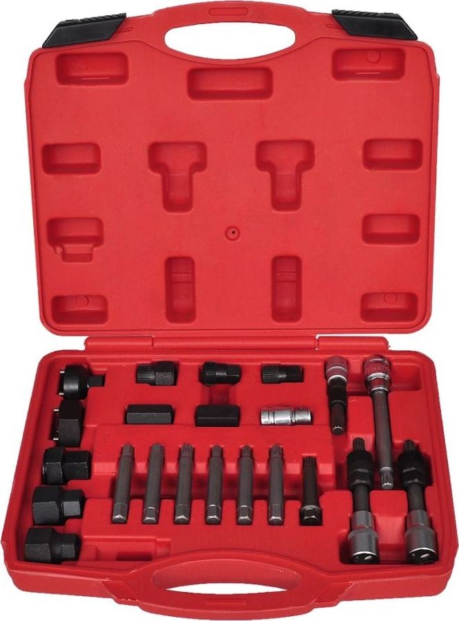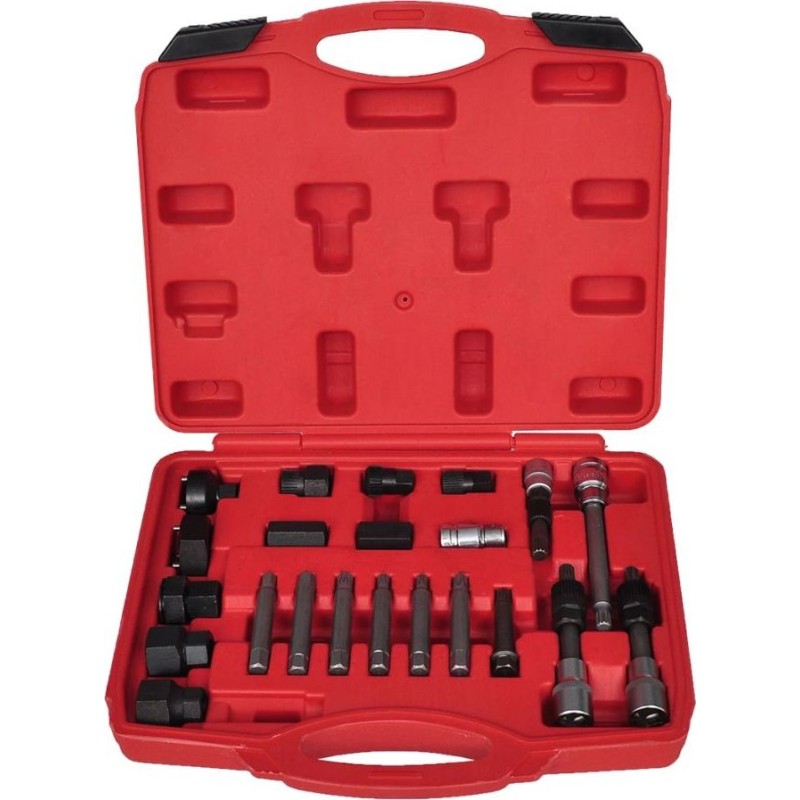 Dieses Set zur Reparatur und zum Ausbau der Lichtmaschinenriemenscheibe enthält verschiedene Adapter, die für alle gängigen Marken geeignet sind, darunter eine vollständige Auswahl an TRX-, Spline- und Sechskant-Adaptern, die für die meisten Lichtmaschinen passen.