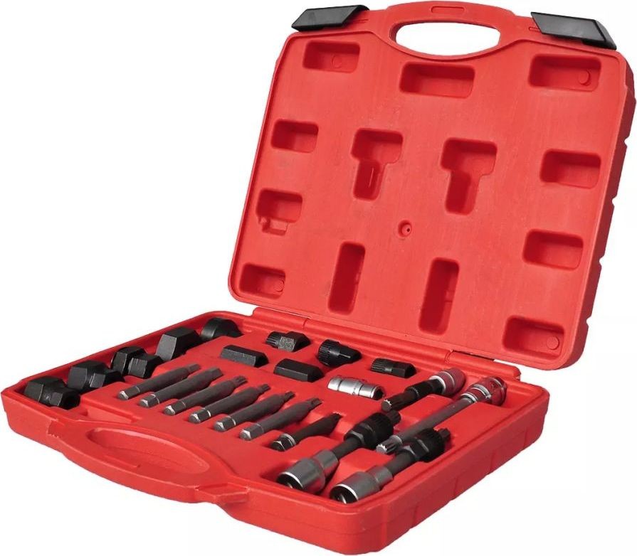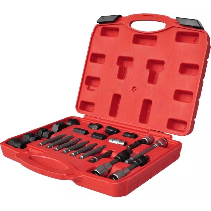 Das Set zum Ausbau der Lichtmaschinenriemenscheibe enthält 22 professionelle Schraubenschlüssel und Steckschlüsseleinsätze. Es ermöglicht den einfachen Ausbau der Lichtmaschinenriemenscheibe. Außerdem kann damit der Lichtmaschinenwellenstift fixiert werden, während gleichzeitig die Riemenscheibenhalterung entfernt wird.