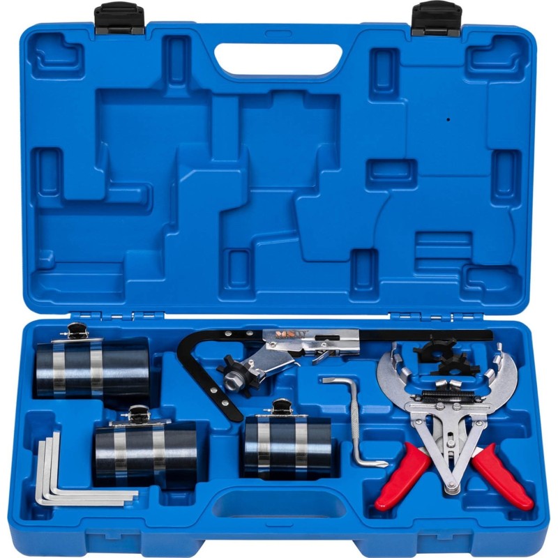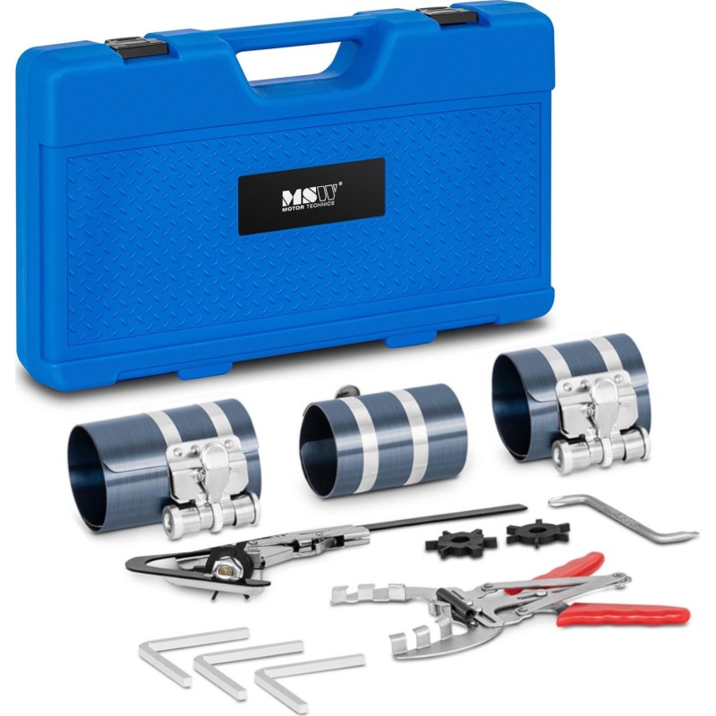 Der Kolbenringabzieher der Marke MSW ist ein Werkzeug zum Ein- und Ausbau dieser Teile. Er erleichtert die Reinigung der Kolbenringe. Das Set besteht aus einem Satz Spannringe für Kolbenringe in verschiedenen Größen sowie einer Zange mit einem Arbeitsbereich von 50–100 mm und einem Spezialwerkzeug mit austauschbaren Klingen zur Reinigung der Kolbenrillen. Die Werkzeuge sind aus Kohlenstoffstahl gefertigt, der hohen Drücken und Belastungen sowie äußeren Einflüssen standhält. Für Sicherheit sorgt eine selbstschließende Verriegelung, die ein vorzeitiges Lösen verhindert und ein zuverlässiges Arretieren ermöglicht. Im Lieferumfang ist ein Koffer zur bequemen Aufbewahrung und zum Transport der Ausrüstung enthalten.
