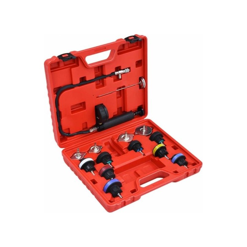 Dieser hochwertige Druck- und Temperaturtester für das Kühlsystem besteht aus 14 Teilen und ist das ideale Werkzeug für Autoliebhaber-Werkstätten und professionelle Mechaniker. Er ist für Fahrzeuge der folgenden Marken geeignet: VW, Audi, Volvo, Saab, Mercedes-Benz, BMW, Renault, Porsche, Jaguar, Mitsubishi, Mazda, Toyota, Honda, Suzuki, Isuzu, Ford, GM, Chrysler, Fiat, Alfa Romeo, Lexus, Peugeot, Jeep, Land Rover usw.