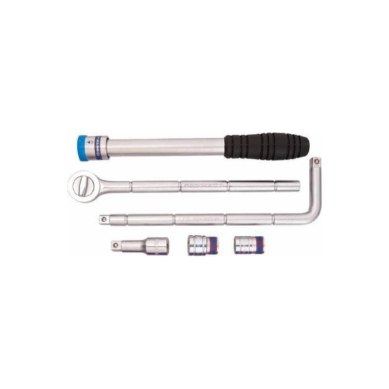 King Tony 4306MRN Radschlüssel-Set mit einer 1/2"-Ratsche und einem 1/2"-L-Griff, der mit der mitgelieferten speziellen Verlängerung und 1/2"-Steckschlüsseleinsätzen mit 17- und 19-mm-Sechskant sowie einer 75 mm langen 1/2"-Verlängerung in einer Stofftasche. Produktkarte – 4306MRN