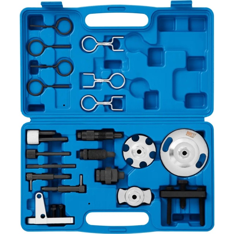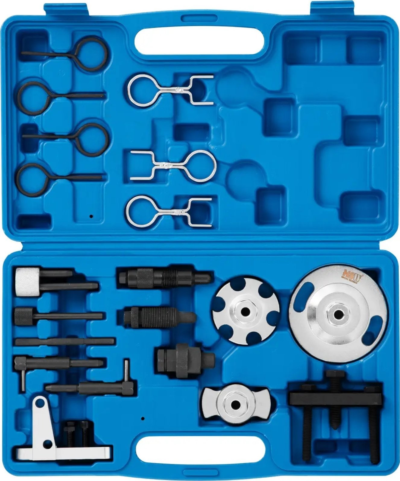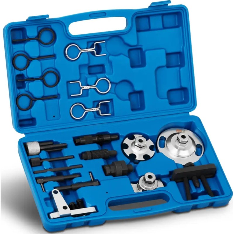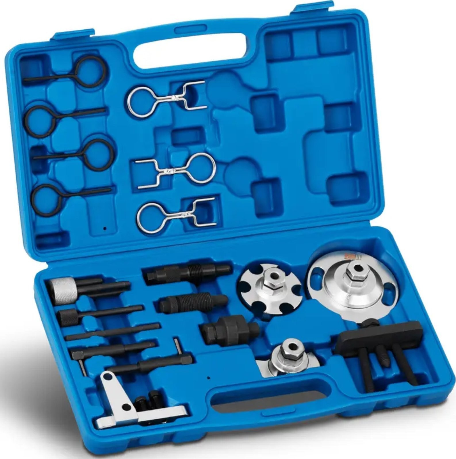 Mit der Nockenwellenarretierung der Marke MSW lassen sich 2,7/3,0-Liter-TDI-V6- oder 4,0/4,2-Liter-TDI-V8-Dieselmotoren in Fahrzeugen der Marken Audi oder Volkswagen reparieren. Dank ihr lassen sich im Handumdrehen der Zahnriemen oder die Steuerkette austauschen, die Nockenwellen und Ausgleichswellen arretieren, die Kurbelwelle fixieren oder andere Reparaturen durchführen. Mit der Nockenwellenarretierung können selbst komplexe Arbeiten an verschiedenen Audi- oder Volkswagen-Modellen durchgeführt werden. Die professionellen Werkzeuge sind präzise auf bestimmte Motorteile abgestimmt und daher einfach zu handhaben. Das Set zur Arretierung der Nockenwelle garantiert eine effiziente Fixierung und Einstellung von Fahrzeugteilen. Das MSW-Set ist zudem verschleißfest. Das Set enthält Adapter für Zahnrad, Kurbelwelle und Nockenwelle, verschiedene Sicherungsbolzen, Halterungen, Abzieher und viele weitere Werkzeuge. Alle Teile des Sets sind aus strapazierfähigem und robustem Kohlenstoffstahl gefertigt , der eine lange Lebensdauer gewährleistet. Daher sollte der Ventilsteuerungs-Satz in keiner professionellen Kfz-Werkstatt oder bei einem Hobby-Mechaniker fehlen. Der sichere Transportkoffer aus Polyethylen ermöglicht es, die Werkzeuge mitzunehmen oder nach der Arbeit aufzubewahren. So lässt sich die Ordnung in der Werkstatt leicht aufrechterhalten, und der Satz ist immer griffbereit.