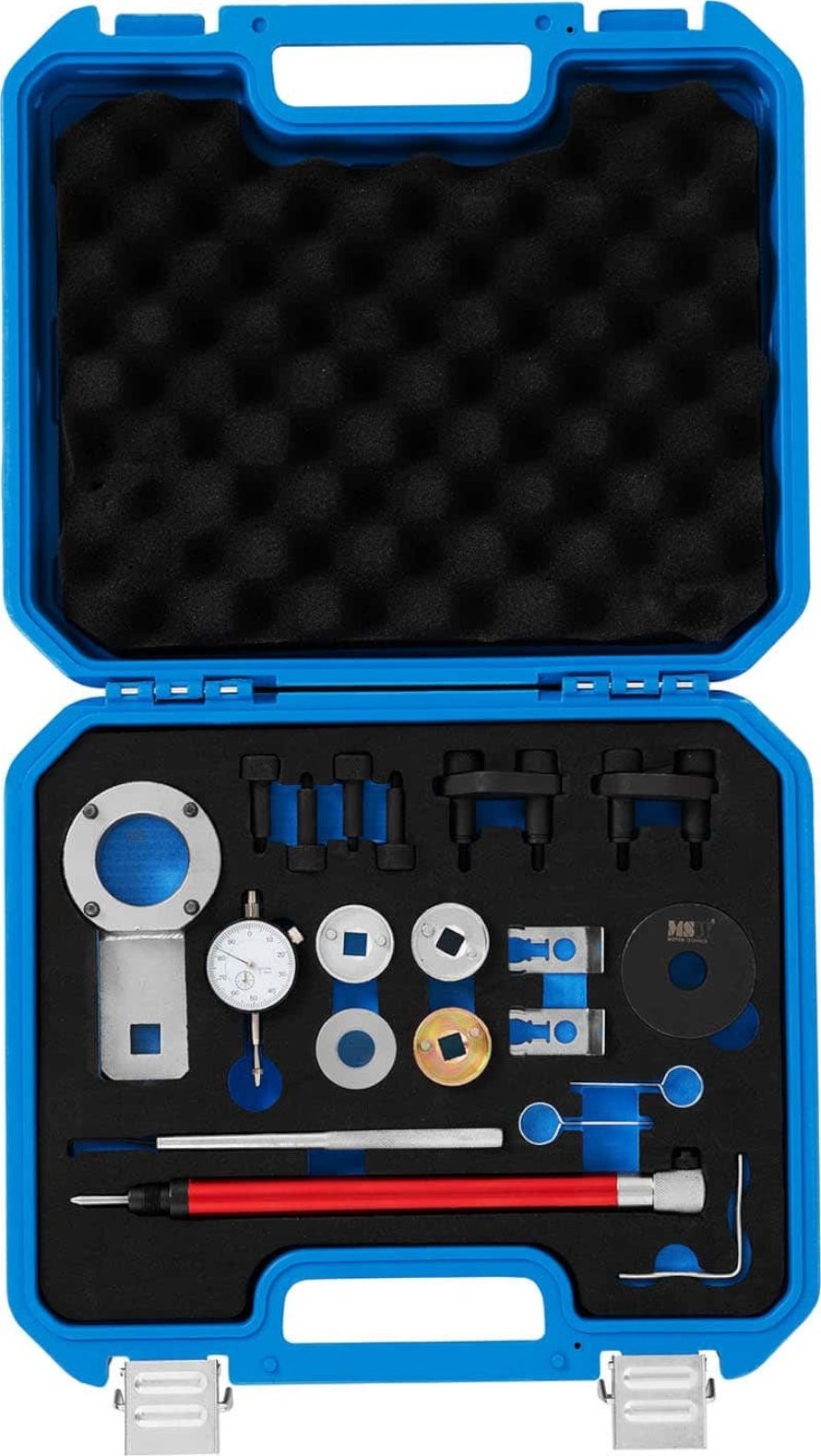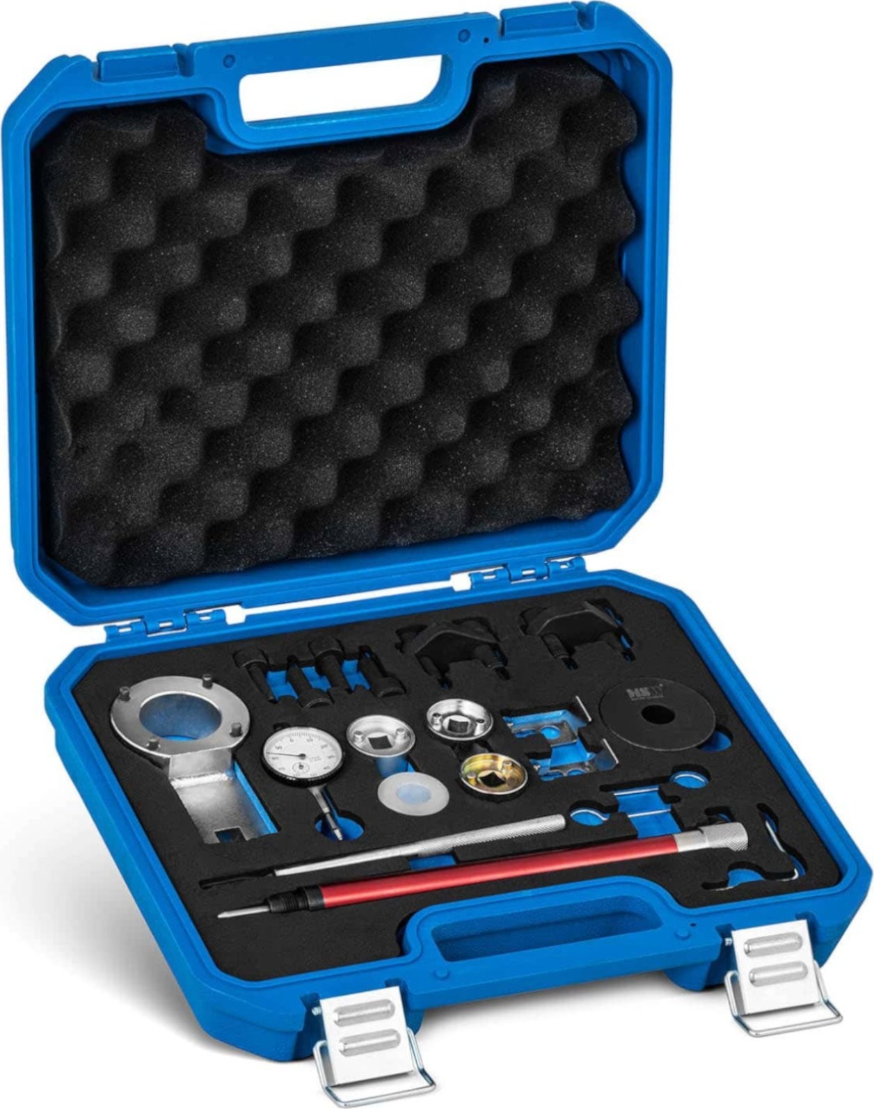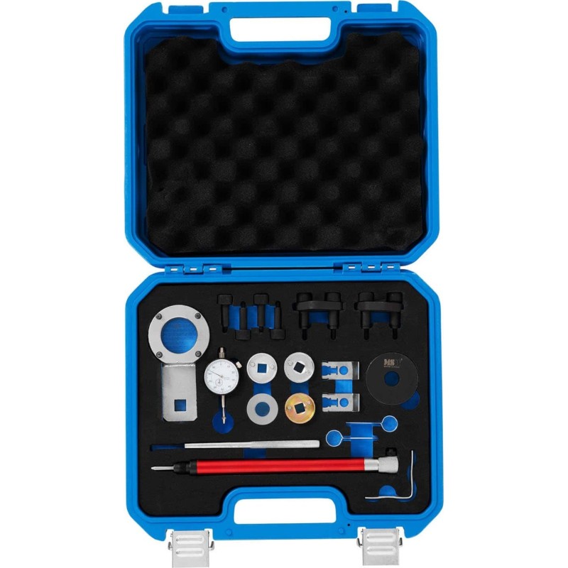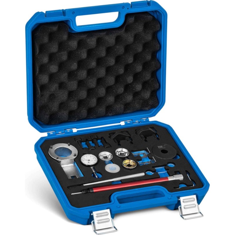 der Nockenwellenarretierung von MSW lassen sich VAG -Motoren der Baureihen 1.8 TSI / TFSI oder 2.0 TSI / TFSI reparieren. Dank dieser Arretierung können Kurbelwellen, Nockenwellen oder Steuerketten im Handumdrehen ausgetauscht und arretiert sowie weitere Reparaturen durchgeführt werden. Die Arretierung ermöglicht die Durchführung selbst komplexer Arbeiten an verschiedenen Fahrzeugmodellen. Die Werkzeuge sind präzise auf bestimmte Motorteile abgestimmt und daher einfach zu handhaben. Das MSW-Set ist zudem verschleißfest. Im Set enthalten sind Werkzeuge zur Einstellung der Nockenwelle und der Kurbelwelle, ein Sicherungsstift für die Ölpumpe, zwei Sicherungselemente für die Kettenräder, eine Kettenspannvorrichtung und viele weitere Teile. Die Werkzeuge sind aus strapazierfähigem und robustem Kohlenstoffstahl gefertigt, der eine lange Lebensdauer gewährleistet. Das Gerät eignet sich daher sowohl für professionelle Kfz-Werkstätten als auch für Hobby-Mechaniker. Wenn das Gerät nicht gebraucht wird, können alle Werkzeuge in einem robusten Kunststoff-Transportkoffer verstaut werden.