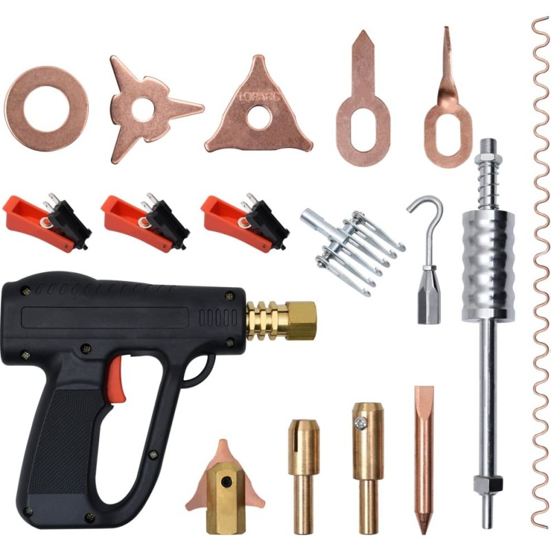 Dieses Set mit Punktschweißpistole enthält 66 Teile, mit denen Sie eine Vielzahl von Schäden an Ihrem Auto beheben können. Der Schwunghammer besteht aus Kohlenstoffstahl und wird auf die Karosserie gesetzt, damit der Puller Dellen effektiv und mühelos herausziehen kann. Die robuste Spitze mit 6 Klauen und der dreieckige Kopf ermöglichen dank der hohen Zugkraft des Hammers das Ausbeulen selbst großer Dellen.