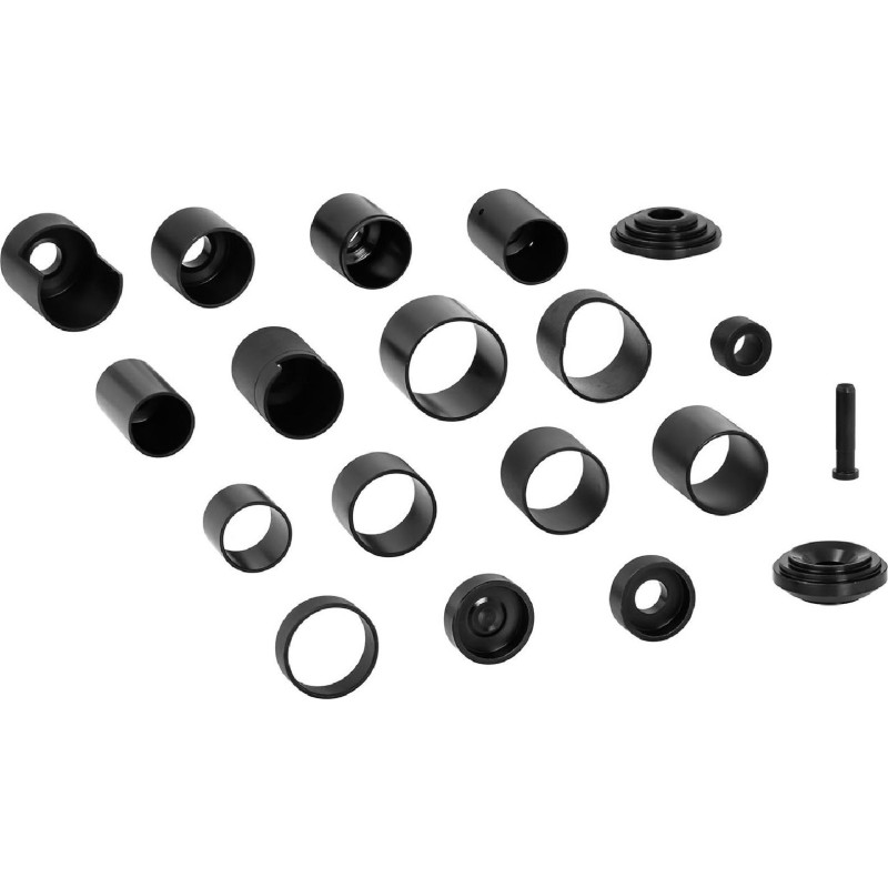 Der Kugelbolzenabzieher der Marke MSW ist ein Zubehörteil für den professionellen Einsatz in Kfz-Werkstätten, Autowerkstätten, Garagen usw. Das Set besteht aus einer Schraube mit M25-Schaft (Länge 27 cm) sowie zahlreichen funktionalen Aufsätzen. Dank dieser Aufsätze kann das Werkzeug zum Aus- und Einbau von Kugelgelenken in Fahrzeugen der Marken Ford (Vans, SUVs und leichte Lkw bis 2003), Dodge (leichte Lkw bis 1998, Durango und Dakota bis 2003), Honda (Accord, Civic, del Sol und Prelude bis 2001) sowie vieler anderer europäischer Marken (Transporter- und SUV-Modelle) verwendet