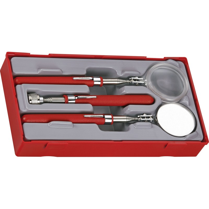 Enthält drei teleskopische Werkzeuge: einen Inspektionsspiegel, eine Lupe und einen Magneten. Alle mit einer Befestigungsvorrichtung für die Hosentasche. Wird in einem Kunststoffbehälter mit abnehmbarem Deckel geliefert. Passt in Werkzeugkisten und -wagen von Teng Tools.