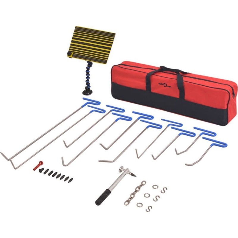 Das Set enthält 10 Stangen, 1 Reflektorplatte mit flexiblem Griff, 1 Ausbeulwerkzeug mit 8 verschiedenen Aufsätzen, 1 Ausbeulhammer, 1 Kette, 3 S-förmige Haken und 3 Ringe. Es wird in einer Tasche geliefert, die den Transport und die Aufbewahrung erleichtert.