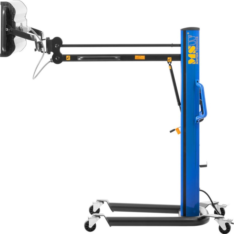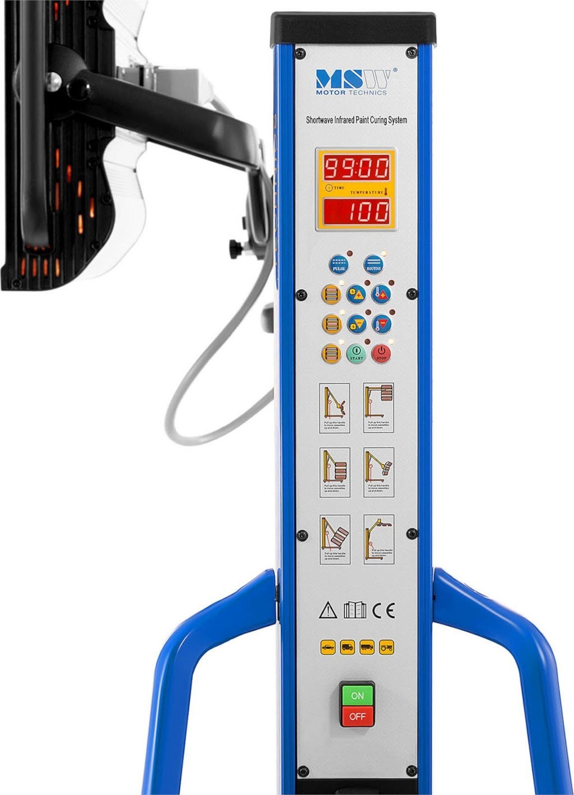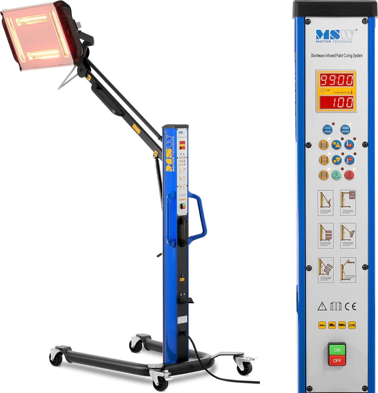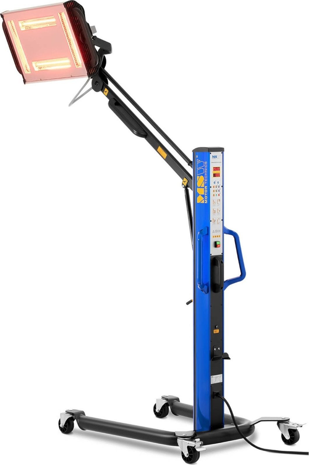 Der Infrarotstrahler der Marke MSW eignet sich für Kfz-Werkstätten, Lackierereien und überall dort, wo Farben, Lacke, Harze oder verschiedene Spachtelmassen schnell trocknen müssen. Die Lampe hat eine Leistung von 4 x 1000 W . Das Gerät trocknet Farben und Lacke effektiver als herkömmliche Geräte, da die Strahlung in das Innere eindringt und die Feuchtigkeit von innen entzieht. Dadurch verhindert es die Bildung von Blasen und beschleunigt den Prozess. Die Infrarotstrahlen geben keine Wärme an die Umgebungsluft ab, sondern übertragen sie direkt auf die Arbeitsfläche. Der hydraulische Arm ist vertikal und horizontal bis zu einer Höhe von max. 240 cm verstellbar. Die Strahler können einzeln ein- und ausgeschaltet werden. Der Einfallswinkel der Strahlen kann je nach den Anforderungen des Werkstücks eingestellt werden. Die gleichzeitig bestrahlte Fläche misst 1200 x 1000 mm . Über das LCD-Display kann die Trocknungszeit im Bereich von 0 bis 99 Minuten eingestellt und überwacht werden; außerdem können die zum Trocknen zu verwendenden Lampen ausgewählt werden. Die Temperatur hängt vom Abstand zum Werkstück ab und kann im Bereich von 40 bis 100 °C variieren. Ein Metallgitter schützt vor Beschädigungen und Verbrennungen. Die Lampenkonstruktion besteht aus robustem Stahl, Rollen mit Bremsen sorgen für Mobilität und Stabilität.