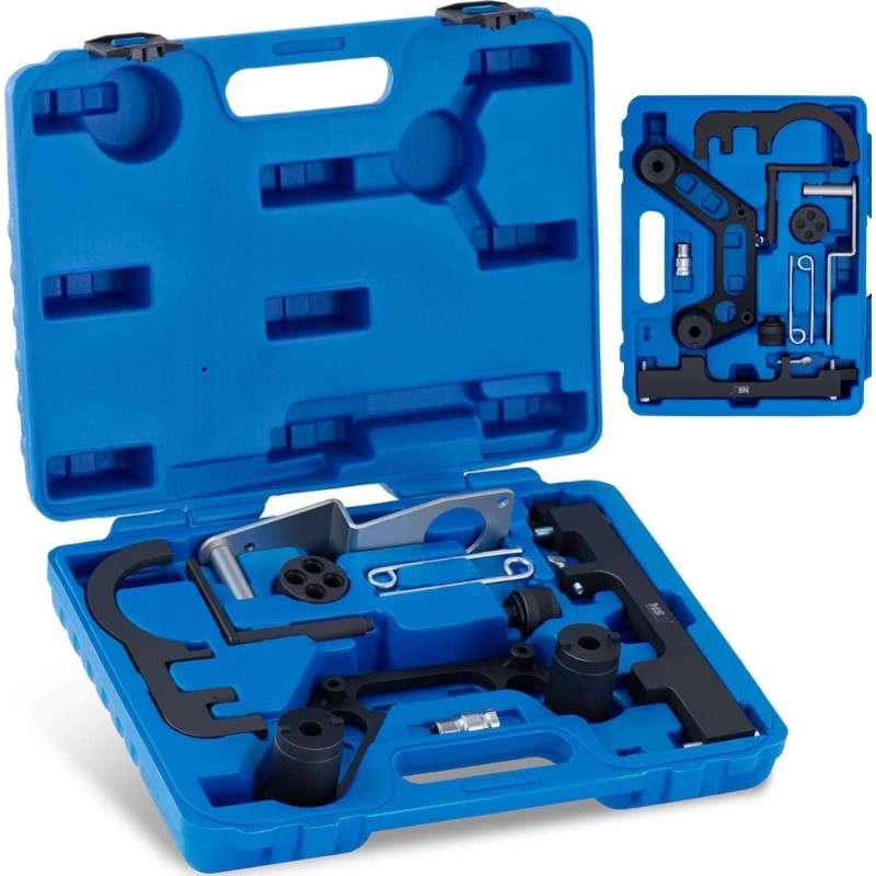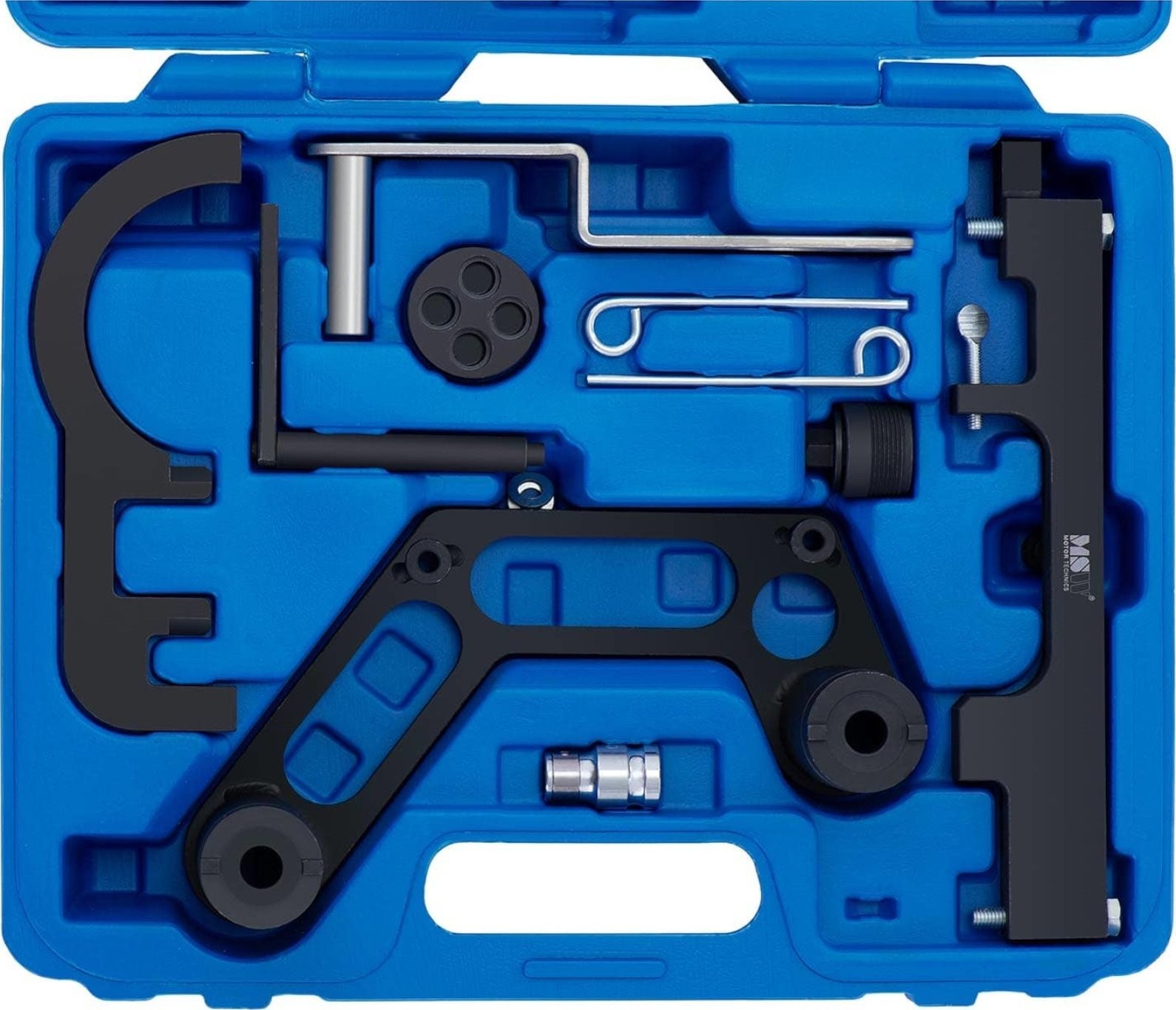 10061751 Mit der Nockenwellenarretierung von MSW lassen sich BMW- und MINI -Dies elmotoren der Typen N47 und N57 reparieren. Damit können Sie die Nockenwelle oder die Steuerkette schnell austauschen und arretieren, die Zylinderkopfdichtung wechseln oder andere Reparaturen durchführen. Die Werkzeuge sind optimal auf die entsprechenden Motorkomponenten abgestimmt und daher einfach in der Anwendung. Die Nockenwellenarretierung garantiert die effektivste Methode zur Fixierung und Einstellung des Motors. Das MSW-Set weist einen sehr geringen Verschleiß auf. Im Set enthalten sind Werkzeuge zur Einstellung von Nockenwellen, Kurbelwellen, eine Spannvorrichtung für die Steuerkette und weitere Teile. Sie sind aus robustem Kohlenstoffstahl gefertigt und gewährleisten somit eine lange Lebensdauer. Wenn das Gerät nicht gebraucht wird, können alle Werkzeuge in einem robusten Kunststoff-Transportkoffer verstaut werden.
