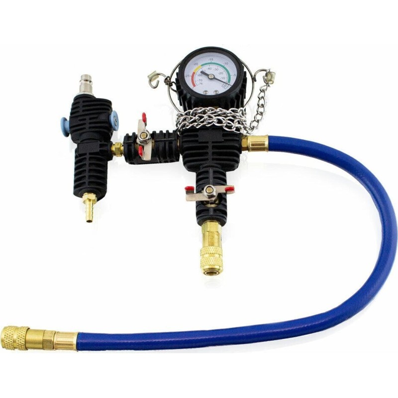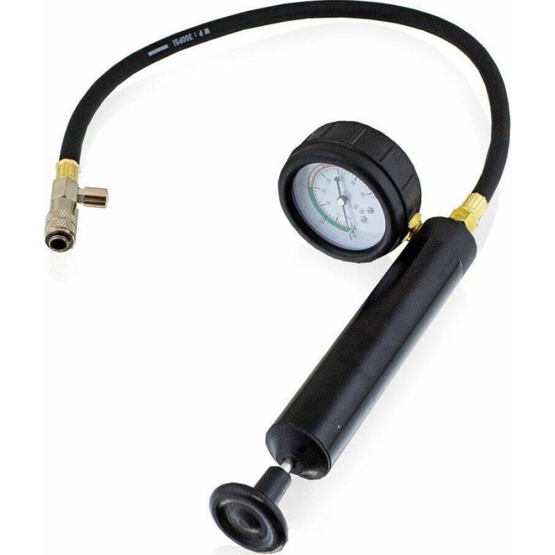 Einfaches und unkompliziertes Kühlsystem-Prüfset, bestehend aus einem Manometer mit Pumpe, einem Einfüllstutzen und verschiedenen Adaptern für verschiedene Fahrzeugmodelle.