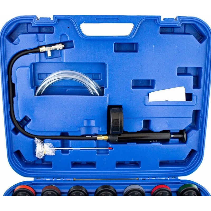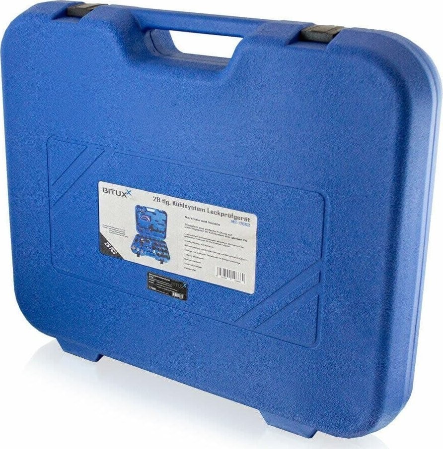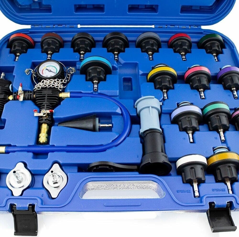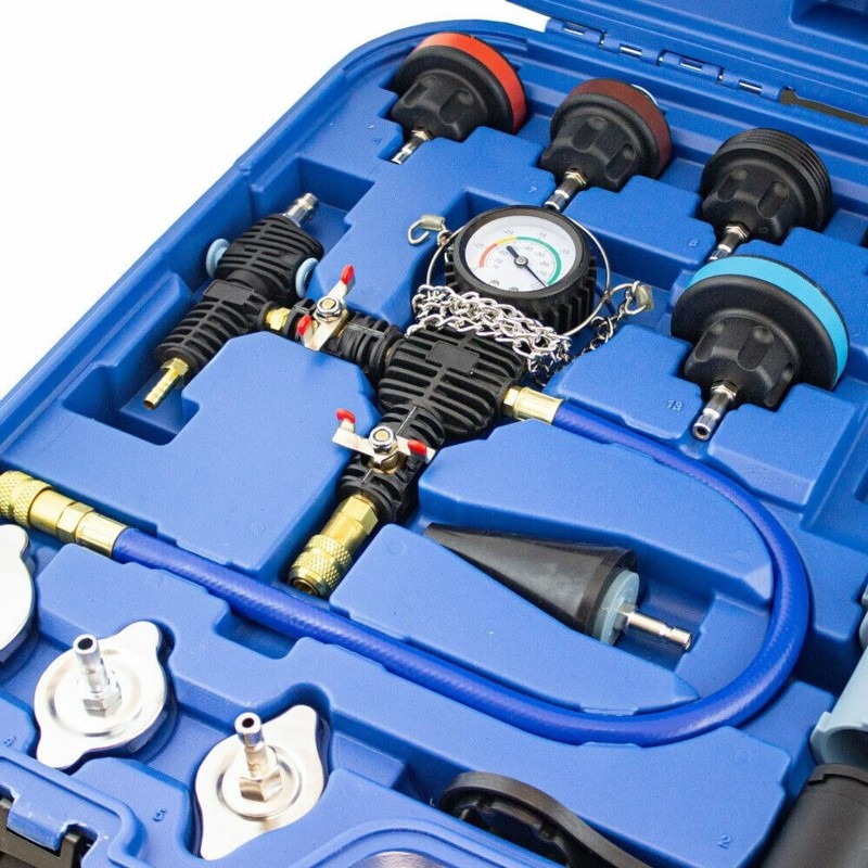 Umfassendes 28-teiliges Testset zur Dichtheitsprüfung des Kühlsystems.