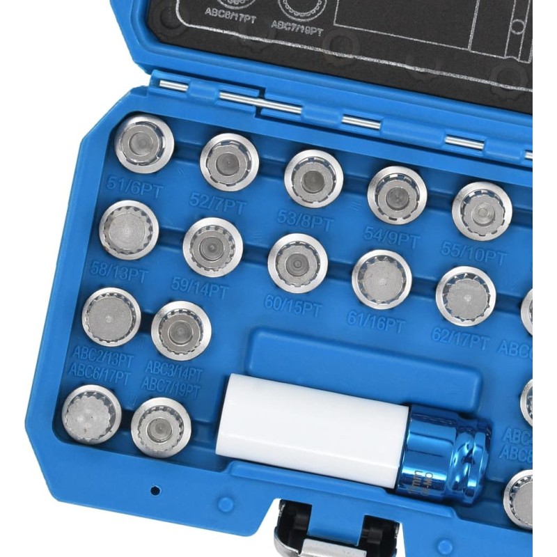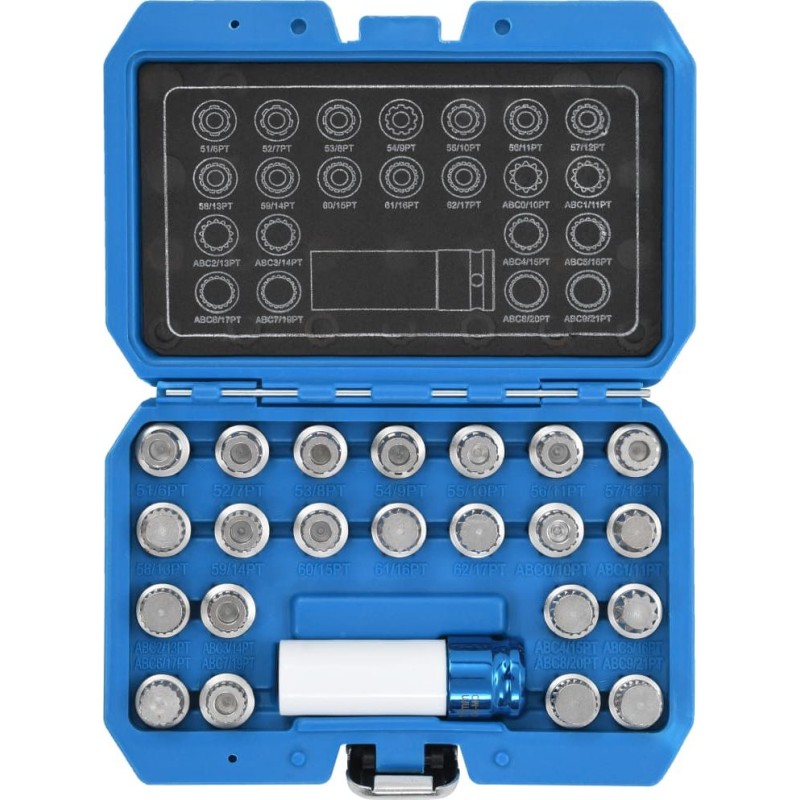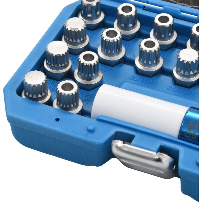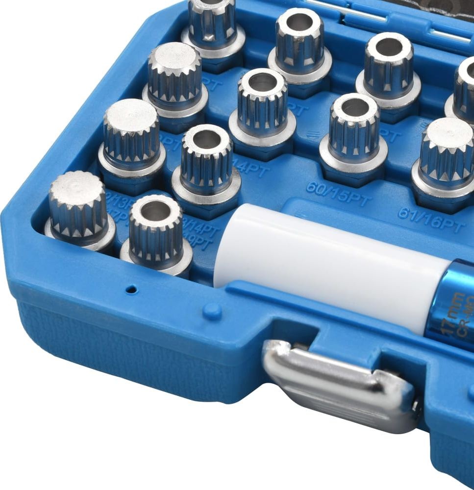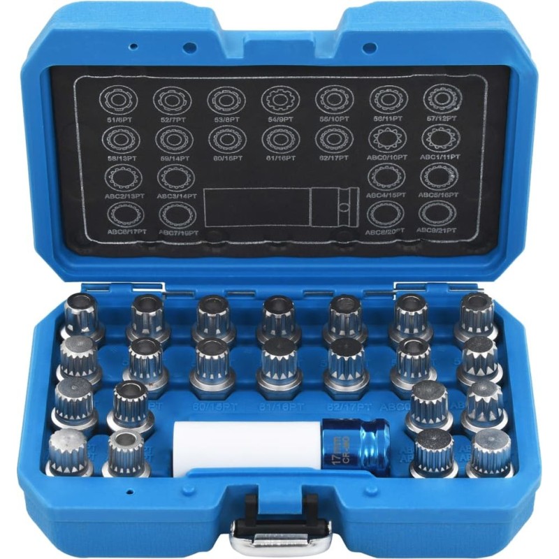 Dieses 23-teilige Steckschlüsselset für Radschrauben enthält 22 Demontagesteckschlüssel in verschiedenen Größen sowie 1 Schutz-Schlagsteckschlüssel. Die Werkzeuge sind für die Montage und Demontage von Radschrauben bei den meisten Fahrzeugen der Marke VAG vorgesehen.