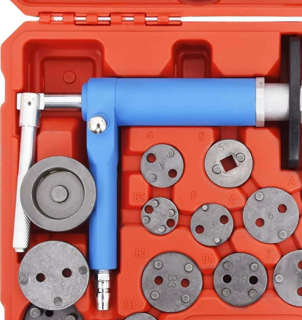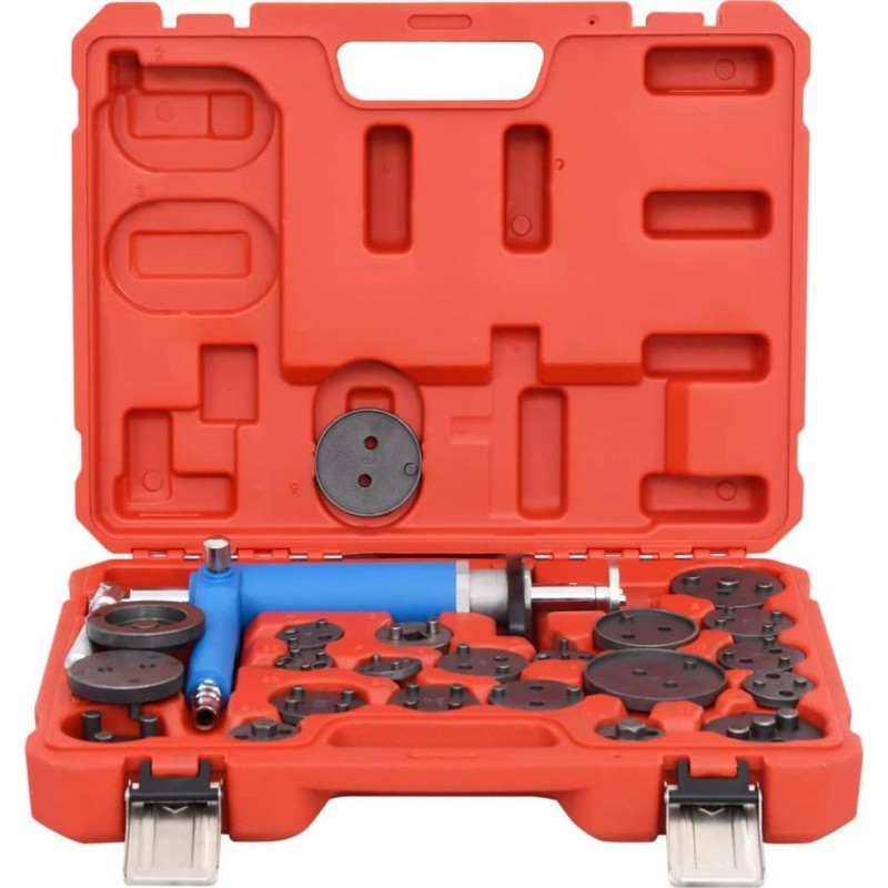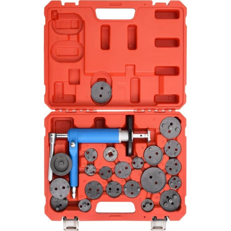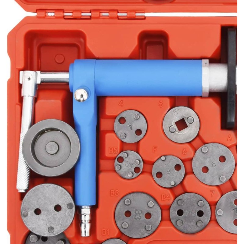 Das Werkzeug wird mit 22 Adaptern geliefert, die für viele gängige Fahrzeugmodelle geeignet sind, und dient zum Einschrauben und Einpressen von Kolben. Die Adapter lassen sich schnell und sicher an der Magnetplatte der Druckluftpistole befestigen. Zudem ist dieses Set in einem Koffer untergebracht, der die Aufbewahrung und den Transport der Werkzeuge erleichtert. Es wird Ihnen die Reparatur von Bremsen erheblich erleichtern.