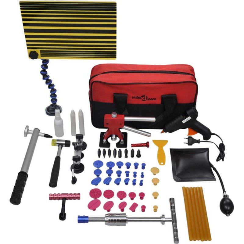Das Set enthält alle notwendigen Werkzeuge zur Ausbeultechnik: eine Reflektionsplatte, einen Satz Klebstoffpistolen, einen Ausbeulhebel sowie Hämmer. Mit diesem Set lassen sich Dellen an fast allen Stellen der meisten Fahrzeuge entfernen. Es wird in einer Tragetasche geliefert, was den Transport und die Aufbewahrung erleichtert.