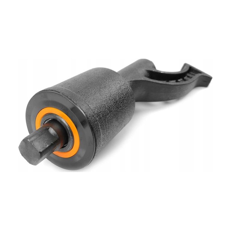 Befestigen Sie die Kurbel und den Aufsatz und setzen Sie den Schraubenschlüssel am Rad an. Arretieren Sie den Anschlagfuß an der nächstgelegenen Schraube – drehen Sie dabei im Uhrzeigersinn. Beginnen Sie anschließend mit dem Lösen mithilfe der Kurbel.