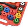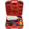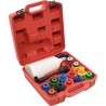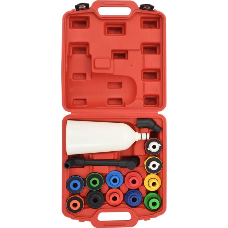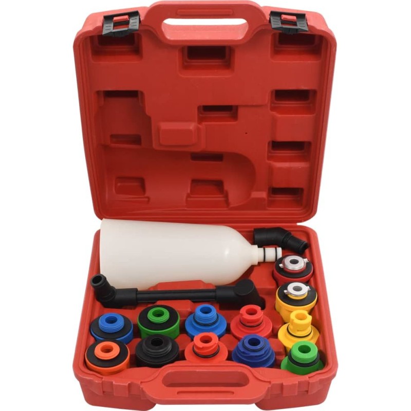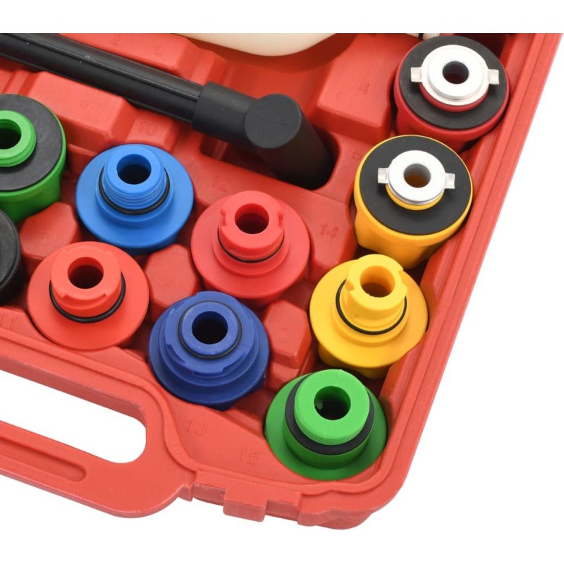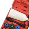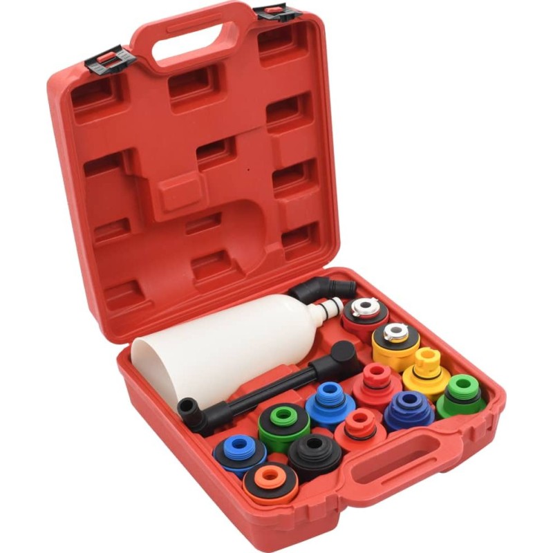 Das Set besteht aus 1 Adapter, 1 Trichter, 1 gebogenem Schlauch und 12 Gewindeadaptern. Es wird in einem geformten Koffer geliefert, der eine einfache Aufbewahrung und den Transport ermöglicht.