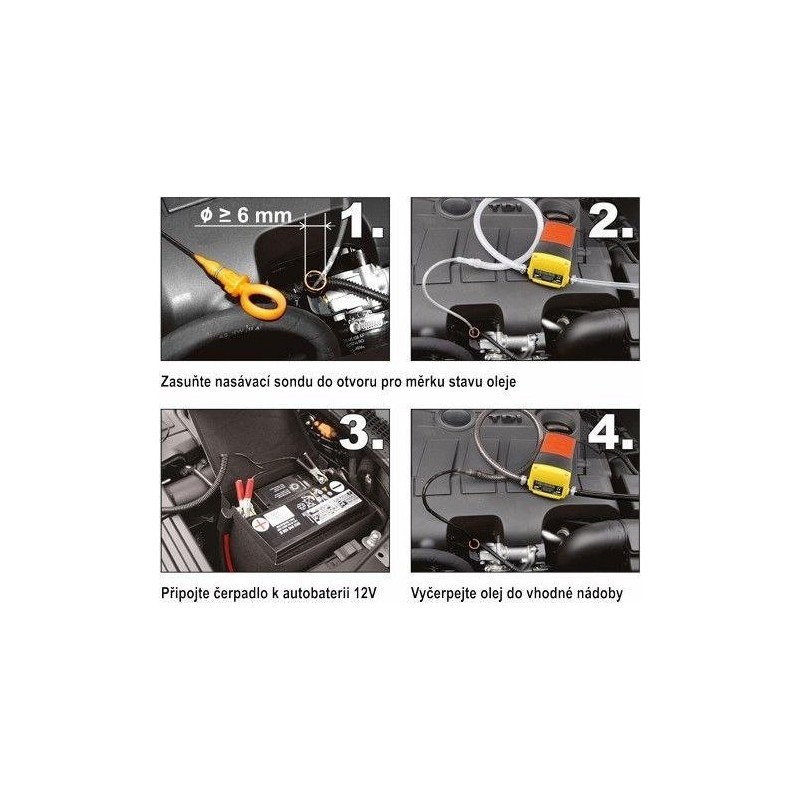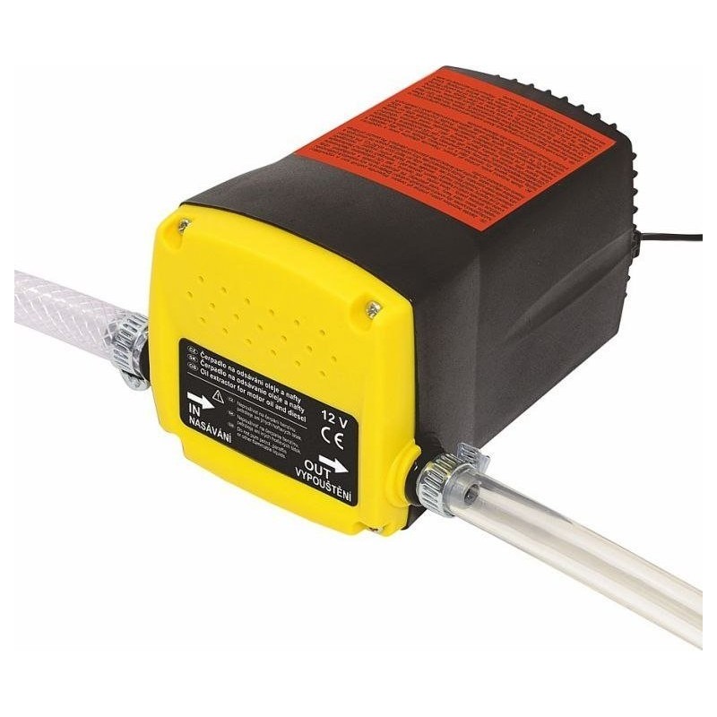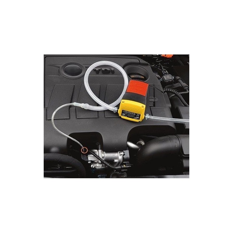 Stromversorgung über Klemmen, ideal zum Anschluss an eine 12-V-Autobatterie. Geeignet für einen einfachen Motorölwechsel. Sie müssen nicht nach dem Ölablassschraube suchen, sondern führen einfach die Saugsonde in die Staböffnung des Ölstandsmessers (bis zu einem Innendurchmesser von 6 mm) ein und saugen das Öl in einen vorbereiteten Behälter ab.