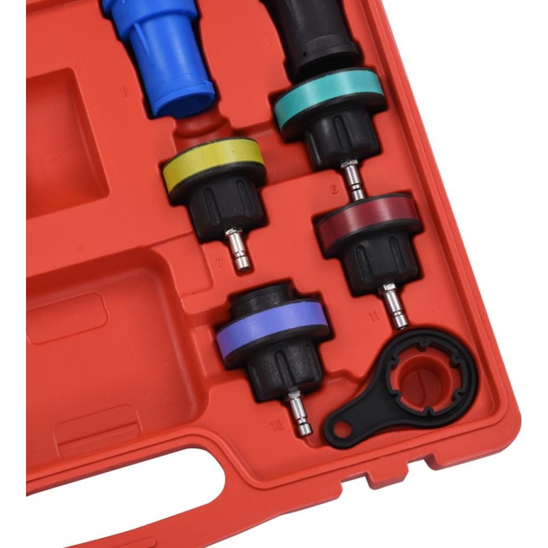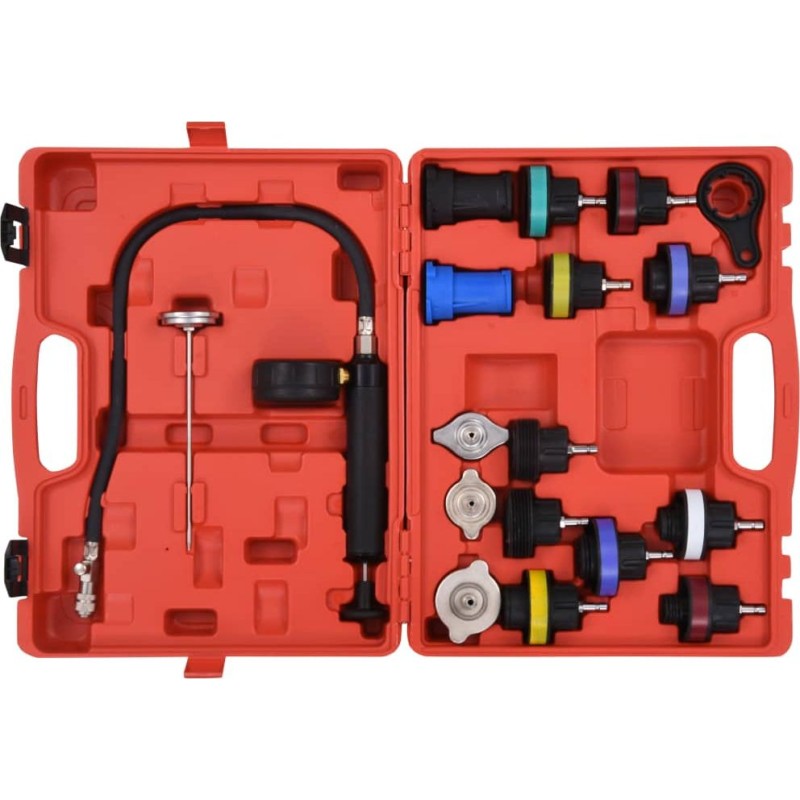 Mit diesem Werkzeugset lässt sich der Druck im Kühlsystem leicht überprüfen und es können Undichtigkeiten im Wassertank aufgespürt werden.