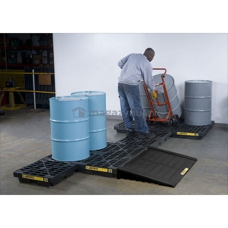 Die Palette eignet sich hervorragend zur Lagerung von Batterien sowie von Fässern und Behältern mit Ölen oder Chemikalien, selbst den aggressivsten. Sie wird zur dauerhaften Auffangung von Leckagen oder als Ort für die Dosierung von Flüssigkeiten aus Behältern und Fässern verwendet. Optionale Verbindungsklammern verbinden die Palettenmodule (Wannen) sicher miteinander, um eine gemeinsame Arbeitsplattform zu schaffen. Falls eine Verbindung zwischen den Modulen hergestellt werden muss, wird ein Überlaufset angeboten, das die Verbindung der Module ermöglicht, um die Gesamtauffangkapazität der Anlage zu erhöhen.