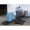 Eine optionale Auffahrrampe mit geringem Neigungswinkel, die mittels Haken am Modul befestigt wird, erleichtert das Aufstellen und Abnehmen schwerer Fässer mit Hilfe von Hubwagen. Die rutschfeste Riffelung der Rampe und der Arbeitsplattform gewährleistet einen sicheren Umgang mit Fässern und Behältern. Die schwarze Farbe verdeckt Verschmutzungen und sorgt für ein ordentliches Erscheinungsbild der Arbeitsumgebung. Der robuste, selbstausrichtende Gitterrost mit einer Stärke von 64 mm ist rutschfest und lässt sich zur Reinigung leicht abnehmen. Er verfügt über ein „grünes“ Zertifikat, ausgestellt von UL Environment.