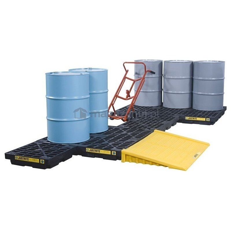 Die Palette eignet sich hervorragend zur Lagerung von Batterien sowie von Fässern und Behältern mit Ölen oder Chemikalien, selbst den aggressivsten. Sie wird zur dauerhaften Auffangung von Leckagen oder als Ort für die Dosierung von Flüssigkeiten aus Behältern und Fässern verwendet. Optionale Verbindungsklammern verbinden die Palettenmodule (Wannen) sicher miteinander, um eine gemeinsame Arbeitsplattform zu schaffen. Falls eine Verbindung zwischen den Modulen erforderlich ist, wird ein Überlaufset angeboten, das die Verbindung der Module ermöglicht, um die Gesamtauffangkapazität der Anlage zu erhöhen.