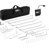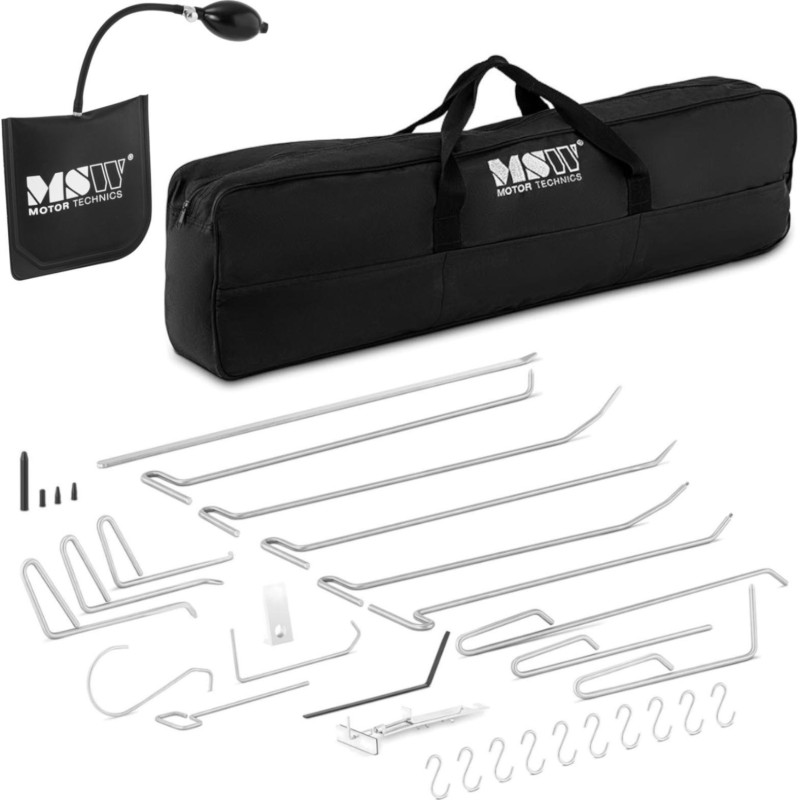 Das Ausbeulset der Marke MSW eignet sich zum Ausbeulen kleinerer Dellen an Autokarosserien, Motorradkotflügeln, Gehäusen von Haushaltsgeräten und anderen Gegenständen aus Blech. Das Set besteht aus einem T-förmigen Griff, Keilen und einem Satz Haken in verschiedenen Größen. Im Lieferumfang sind zwei Tragetaschen enthalten.
