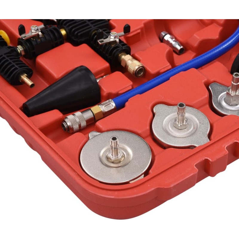 Das aus hochwertigem Kunststoff und Aluminium gefertigte Werkzeugset ist praktisch, verschleißfest und rostfrei. Es enthält farblich gekennzeichnete Kühlerprüfgeräte, was deren Identifizierung und die Auswahl des richtigen Prüfgeräts erleichtert. Es eignet sich für die meisten inländischen und importierten Fahrzeuge.