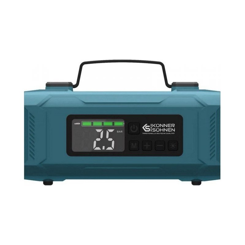 TECHNISCHE DATEN: Akkutyp Lithium-Ionen-Akku, mAh 14800 Spannung, V 15 Max. Luftdruck, psi 140 Füllgeschwindigkeit, l/min 22 Maximales Luftvolumen, l/min 360 Dauerbetriebszeit, min 8 Verfügbare Maßeinheiten PSI, BAR USB-Ausgang 5V/2A LED-Lampe + Nenn-Einschaltstrom, A 800 Spitzeneinschaltstrom, A 2000 Ladezeit des Geräts, Std. 6 Betriebstemperatur, °C -4 °C ... +50 °C Nettoabmessungen (LxBxH), mm 205×77×114 Bruttoabmessungen (LxBxH), mm 245×134×168 Bruttogewicht, kg 1,6 SCHNELLSTART FÜR AUTOS Der moderne, hochwertige Lithium-Ionen-Akku mit 14800 mAh und hohem Entladestrom eignet sich für Benzinmotoren bis 8 Liter und Dieselmotoren bis 5 Liter. Das Gerät liefert sofort einen Spitzenstrom von bis zu 2000 A, sodass Sie den Motor Ihres Fahrzeugs in wenigen Sekunden starten können. HOCHDRUCK-AKKU-LUFTKOMPRESSOR Der 140-PSI-Hochdruck-Akku-Luftkompressor hat eine Pumpgeschwindigkeit von 22 l/min und ermöglicht das schnelle Aufpumpen und Entleeren von Ausrüstung, ohne dass ein Anschluss an eine Stromquelle erforderlich ist. Er kann auch als Manometer zur Messung des Reifendrucks verwendet werden. DIGITALES DISPLAY Das Display erleichtert die Bedienung des Geräts, ermöglicht es, die Pumpparameter jederzeit in den gewählten Maßeinheiten (PSI, bar) abzurufen, unterstützt das Speichern zuvor eingestellter Werte und zeigt Informationen zum Ladezustand des Akkus an. MULTIFUNKTIONALE LED-TASCHENLAMPEN Die integrierte helle Taschenlampe am Gehäuse ist nützlich, wenn der Arbeitsbereich im Dunkeln oder bei schlechten Lichtverhältnissen beleuchtet werden muss. Sie verfügt über drei Betriebsmodi: Leuchten, Blinken und SOS-Modus. MAXIMALER SCHUTZMAXIMALER SCHUTZ: vor Stromüberlastung, Überladung, Tiefentladung, Überhitzung, Verpolung und Überspannung. POWERBANK-FUNKTION Dank der integrierten kompakten, tragbaren Batterie mit einer hohen Kapazität von 14800 mAh kann das Gerät als Powerbank zum Aufladen von Gadgets dienen und verfügt über einen USB-2A-Ausgang. 5 MODI Das Gerät verfügt über 5 Pumpmodi: Auto, Motorrad, Fahrrad, Sportgeräte und Hochleistungsmodus. Ausgestattet mit einer automatischen Luftzufuhrunterbrechung, sobald bestimmte Parameter erreicht sind. ...