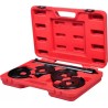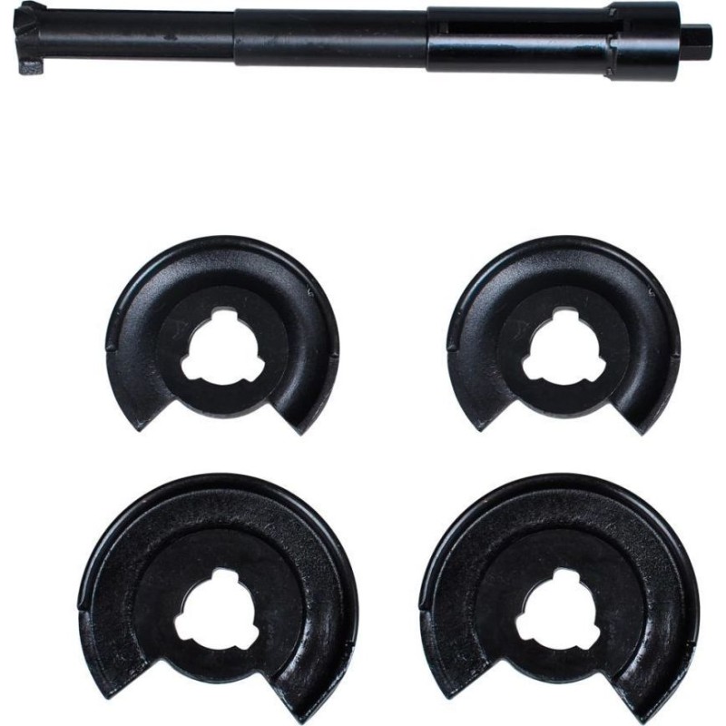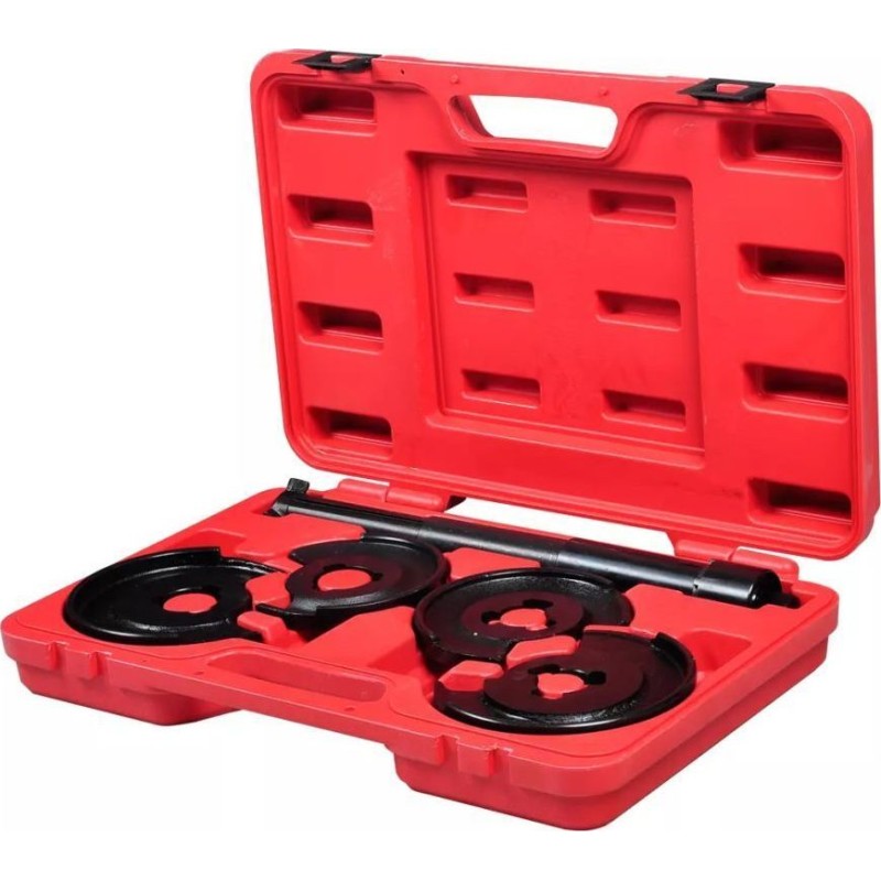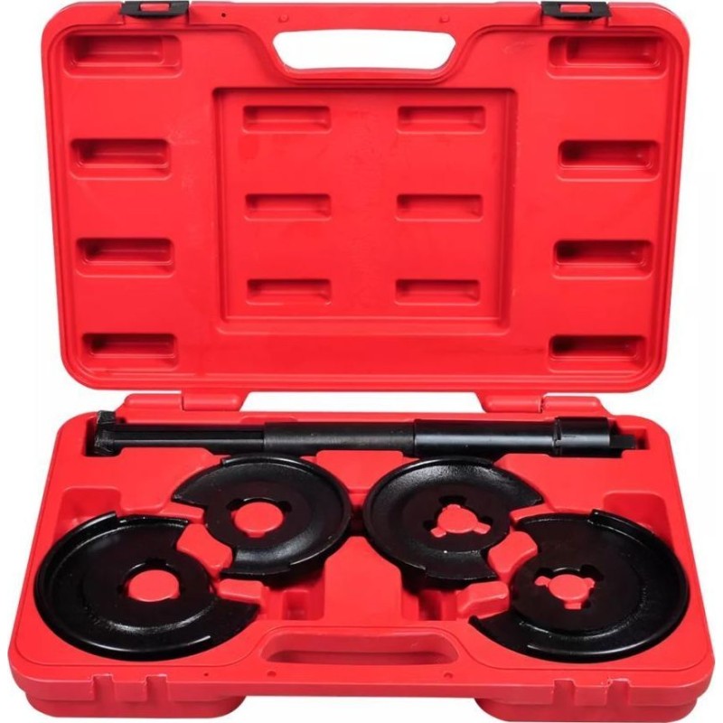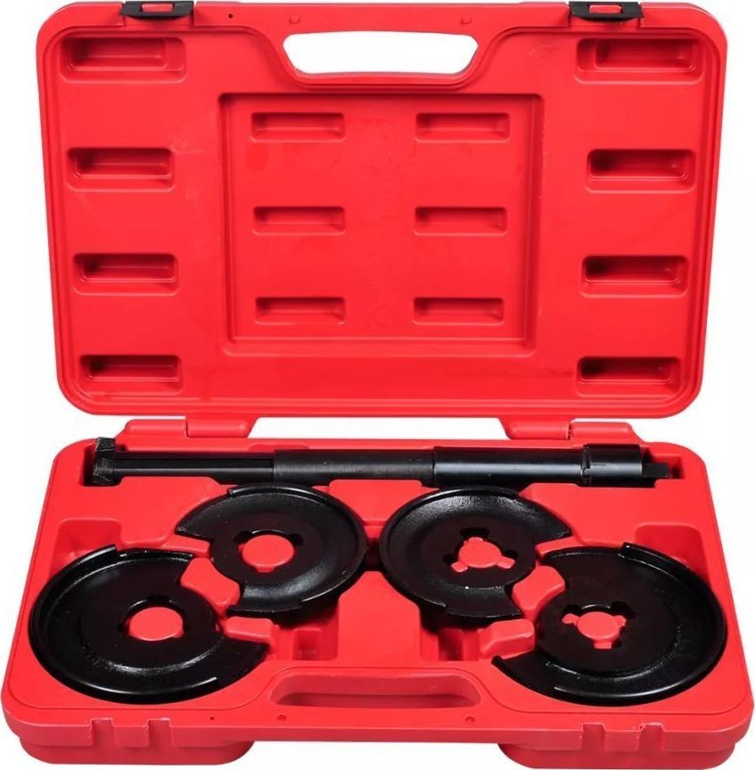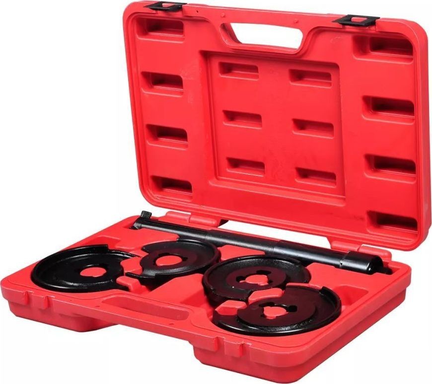 Die teleskopische Federbefestigungsvorrichtung mit einem speziellen rutschfesten Griff sorgt für einen festen Halt. Mit diesem Set lassen sich Schraubenfedern an den Querlenkern austauschen und entfernen, ohne dass die Achse demontiert werden muss, was Zeit und Geld spart.