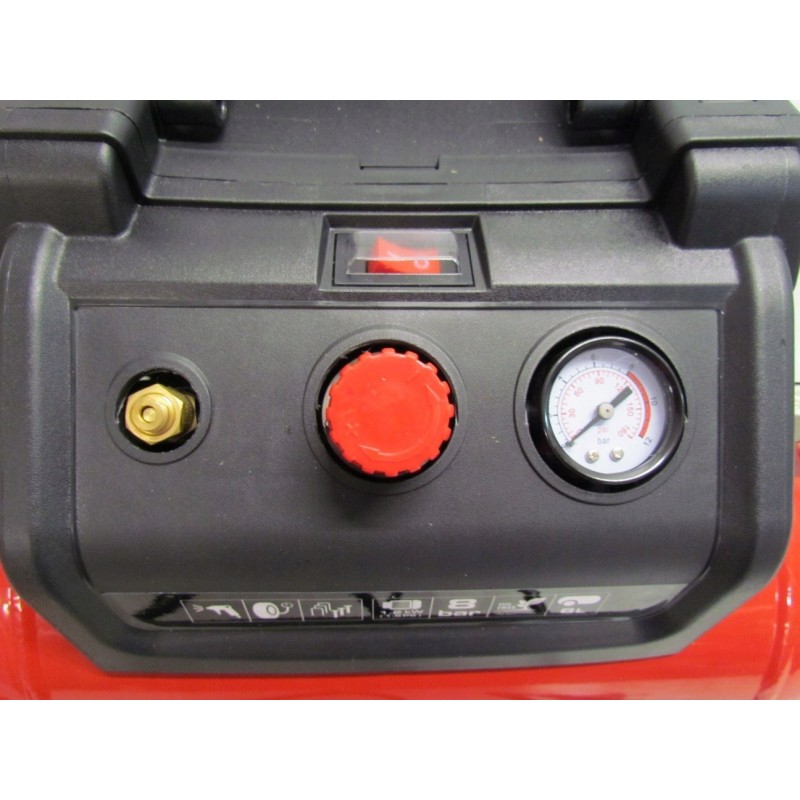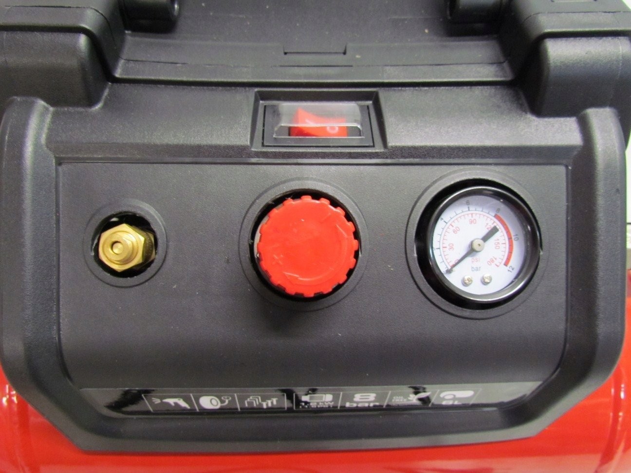 Das Gerät ist mit einem Druckregler ausgestattet, der eine Druckeinstellung von 0 bis 8 bar ermöglicht. Der aktuelle Betriebsdruck ist auf dem Manometer neben dem Einschaltknopf des Kompressors ablesbar und wird über eine Schnellkupplung gemessen.