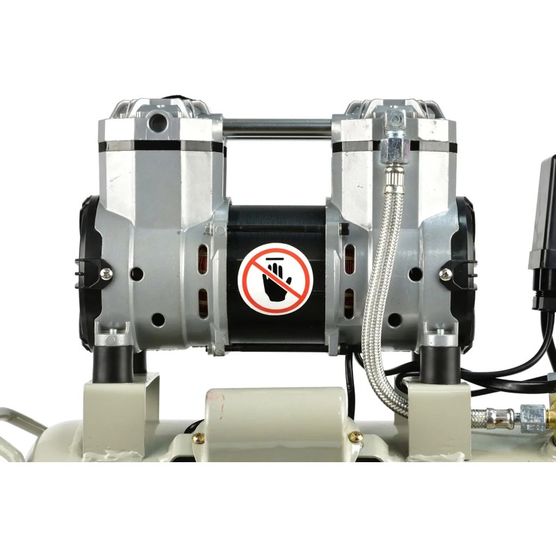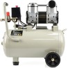 Der Kompressor ist mit einer ölfreien Pumpe ausgestattet, die für den Dauerbetrieb geeignet ist. Im Lieferumfang enthalten sind ein Manometer zur Anzeige des Tankdrucks sowie ein Druckminderer mit Manometer, mit dem der Ausgangsdruck eingestellt und abgelesen werden kann. Ölfreie Kompressoren zeichnen sich im Vergleich zu herkömmlichen Ölkompressoren durch eine deutlich ruhigere Laufkultur aus. Sie sind besonders für den Einsatz dort zu empfehlen, wo die Druckluft nicht mit Öl verunreinigt werden darf.