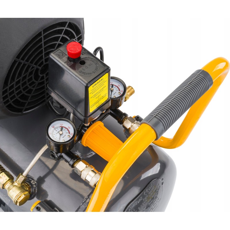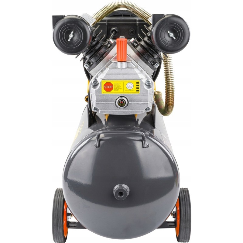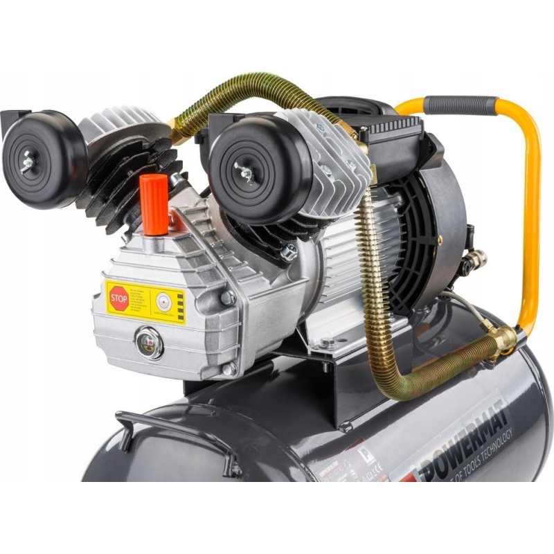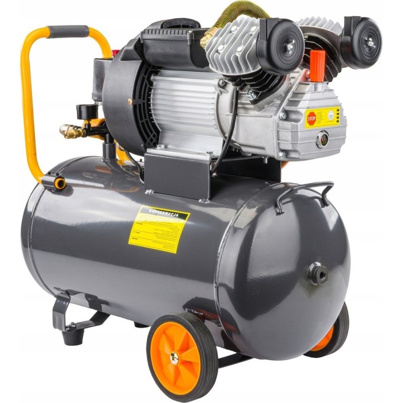 ⭐ ÖLKOMPRESSOR POWERMAT 50L | 2-Zylinder „V-Typ“ Modell: PM-KO-50T-V2 ⭐ TECHNISCHE DATEN: Marke – POWERMAT Stromversorgung – 230 V / 50 Hz Motorleistung – 2,2 kW / 3 PS Drehzahl – 2850/min Effektive Förderleistung – 392 l/min Tankvolumen – 50 l Maximaler Ausgangsdruck – 8 bar Nettogewicht – 39 kg Schallleistungspegel LWA – 97 dB(A) Unsere Kompressoren verfügen über alle erforderlichen Zertifikate und wurden im Labor einer EUROPÄISCHEN BENANNTEN STELLE geprüft, was uns von vielen anderen Herstellern auf dem Markt unterscheidet. Die Kompressoren können bei der Technischen Aufsichtsbehörde angemeldet werden. ⭐ LEISTUNG UND ZUVERLÄSSIGKEIT ➡️ Leistungsstarker Kompressor Der Zweizylinder-Kompressor in V-Anordnung sorgt für einen Druck von 8 bar im Behälter und eine effektive Förderleistung von 392 l/min. Der Kompressor wird von einem Elektromotor mit einer Leistung von 2,2 kW / 3 PS angetrieben. ➡️ Zuverlässige Konstruktion Die massiven Kompressorzylinder bestehen aus Gusseisen, was ein hohes Maß an Zuverlässigkeit gewährleistet. Das hohe Gewicht des Zylinders sorgt für eine angemessene Wärmeableitung, sodass der Kompressor während des Betriebs nicht überhitzt. Alle Zu- und Ableitungen bestehen aus Kupfer, was eine angemessene Wärmeableitung gewährleistet. ⭐ VIELSEITIGER EINSATZ UND SICHERHEIT Der Kompressor PM-KO-50T-V2 der polnischen Marke POWERMAT ist ein Gerät, das für Lackieranwendungen, Ausblasen, Pumpen, Sandstrahlen, Reinigen und ähnliche Tätigkeiten bestimmt ist. Zu den wertvollen Vorteilen unserer Kompressoren zählen niedrige Betriebskosten, Vielseitigkeit, Präzision und ein leiser Lauf. ➡️ Druckregler Das Gerät verfügt über 2 Ausgänge mit standardisierten europäischen Schnellkupplungen „EURO“. Einer der Ausgänge ist über einen integrierten Druckminderer regelbar, wobei der Arbeitsdruck auf dem Manometer angezeigt wird. Der zweite Ausgang liefert den vollen Druck aus dem Behälter, das Manometer zeigt dann den aktuellen Druck im Behälter an. ➡️ Sicherheitsventil und Druckschalter Der Druckschalter ist auf einen Maximaldruck von 8 bar eingestellt. Erreicht der Druck im Behälter diesen Wert, schaltet sich der Kompressor ab; die Wiedereinschaltung erfolgt, sobald der Druck im Behälter unter 6 bar fällt. Die Sicherheit im Falle einer Störung oder Blockierung des Druckschalters gewährleistet ein zertifiziertes Sicherheitsventil. Dieses wird aktiv, wenn der sichere Druckwert im Behälter überschritten wird, und lässt bei Bedarf den Überschuss ab. ⭐ VERARBEITUNGSQUALITÄT Der Kompressortank ist innen und außen verzinkt. Der Tank ist mit einem Ablassventil ausgestattet, über das angesammeltes Wasser abgelassen werden kann, was ihn vor Korrosion schützt. ⭐ MOBILITÄT Die Mobilität des Geräts wird durch Laufrollen aus strapazierfähigem, thermisch ausgehärtetem Kunststoff gewährleistet, die mit einer abriebfesten Gummibeschichtung versehen sind. Ein zusätzlicher Tragegriff erleichtert das Bewegen des Kompressors im Arbeitsbereich. ⭐ SICHERER VERSAND DES GERÄTS Wenn der Kompressor während des Transports in einer falschen Position steht, kann Kompressoröl durch die Luftfilter austreten, was in vielen Fällen zu Funktionsstörungen führt. Wir kümmern uns um unsere Kunden und ihre Geräte, deshalb sind die von uns verkauften Kompressoren nicht mit Öl befüllt, was sie während des Transports schützt.