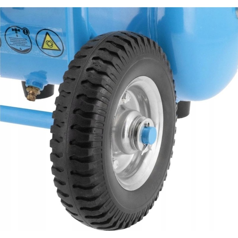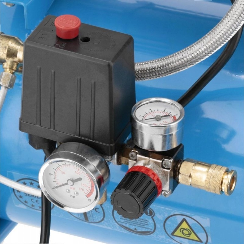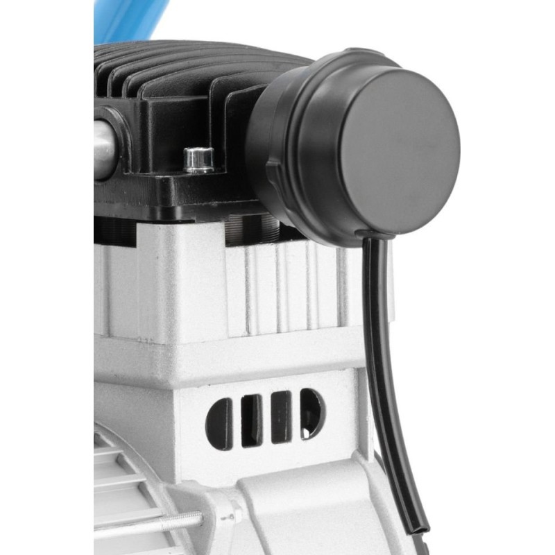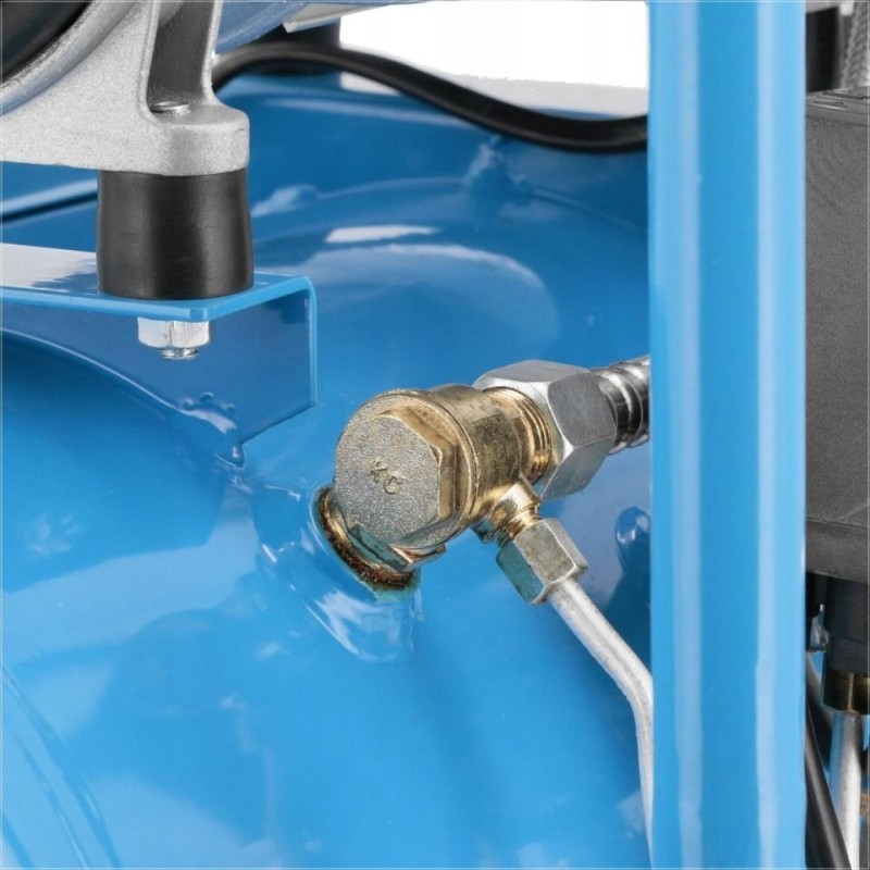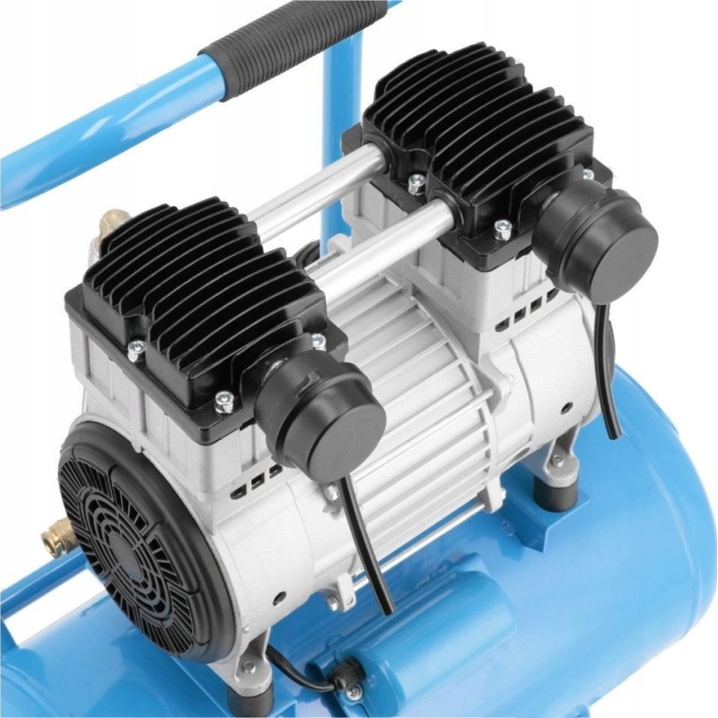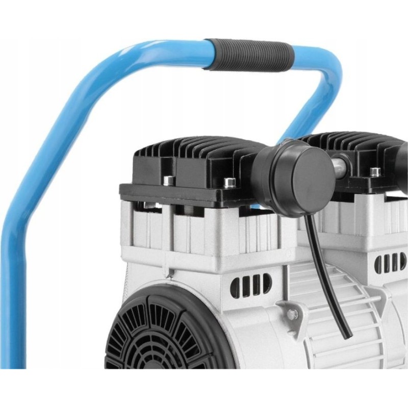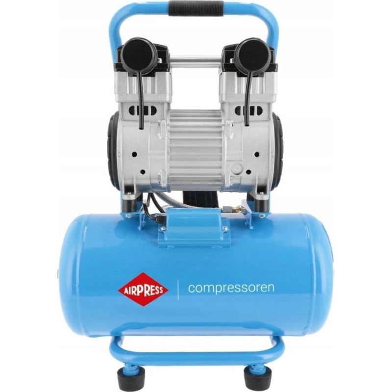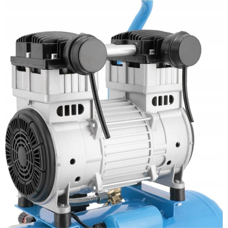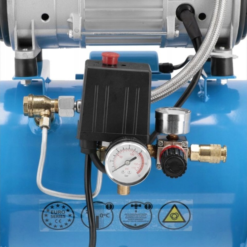 Der leise und ölfreie Kompressor verfügt über einen 2,0 PS/1,5 kW starken Zweizylindermotor und eine Drehzahl von 1400 U/min. Der Einschaltdruck beträgt 6 bar, der maximale Druck 8 bar und die Förderleistung des Kompressors 150 l/min.