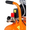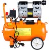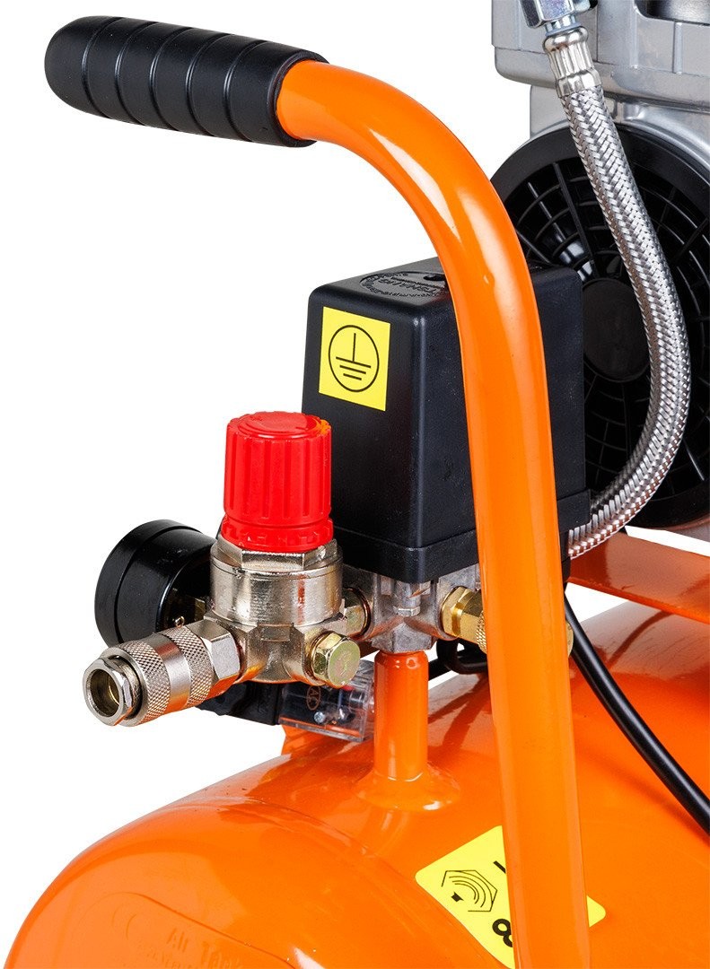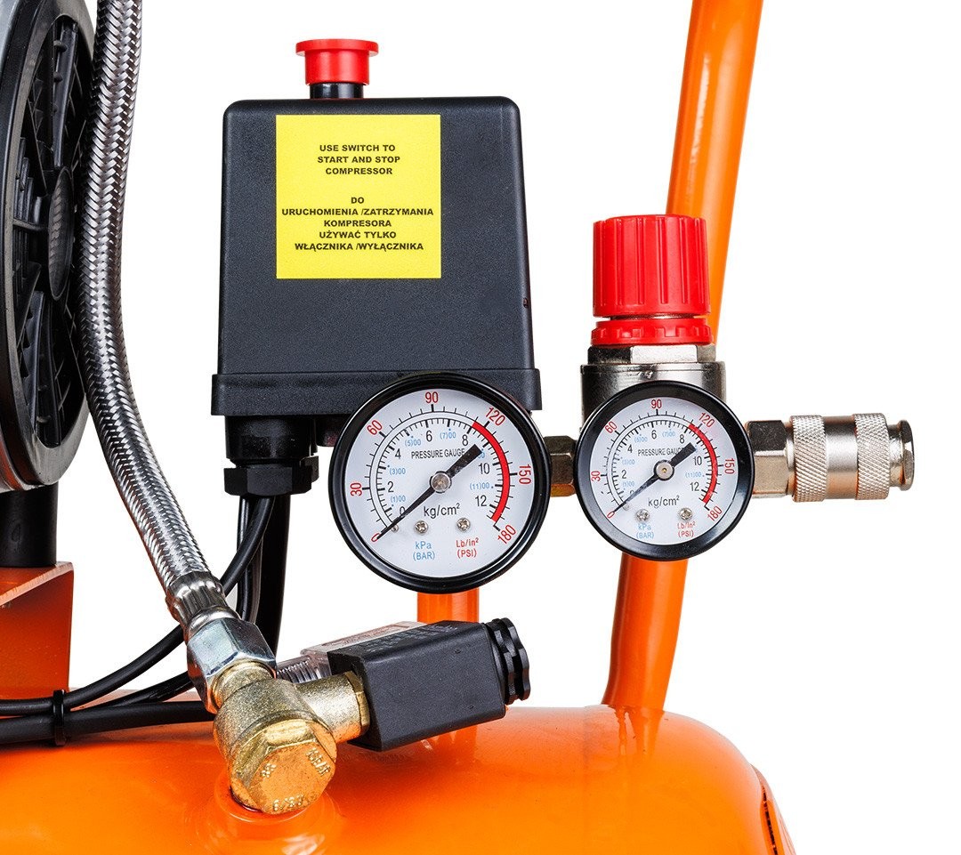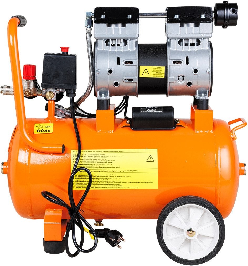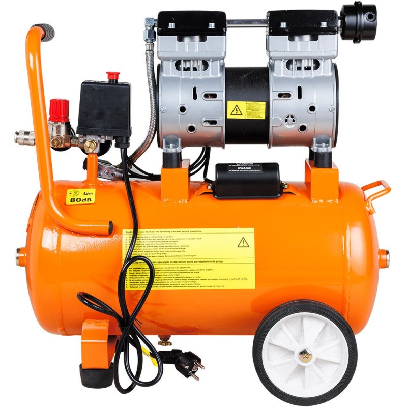 Ölfreier Kompressor, Tankvolumen 24 l, Stromversorgung 230 V / 50 Hz, Motorleistung 750 W, 1450 U/min, Förderleistung 125 l/min, maximaler Druck 8 bar (115 PSI), Schallpegel: 80 dB, IPX0, S1, Schutzklasse I, Gewicht 21 kg, zwei Räder mit einem Durchmesser von 14,6 cm, zwei Manometer, zwei Anschlüsse, Druckregler, Tankabmessungen: 240 × 410, Tankfüllzeit: 135 s.