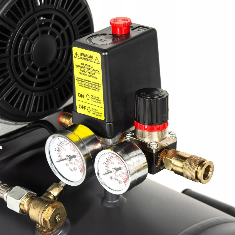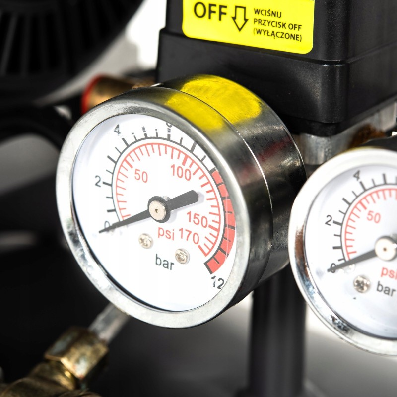 Der NAC-Kompressor ist sehr einfach zu bedienen. Er verfügt über ein in den Tank integriertes Bedienfeld mit einem Schalter, einem Drehknopf zur Druckeinstellung, einem Manometer zur Anzeige des aktuellen Arbeitsdrucks, einem Manometer zur Anzeige des Tankdrucks, einer Schnellkupplung zum Anschließen des Schlauchs sowie einem Sicherheitsventil.