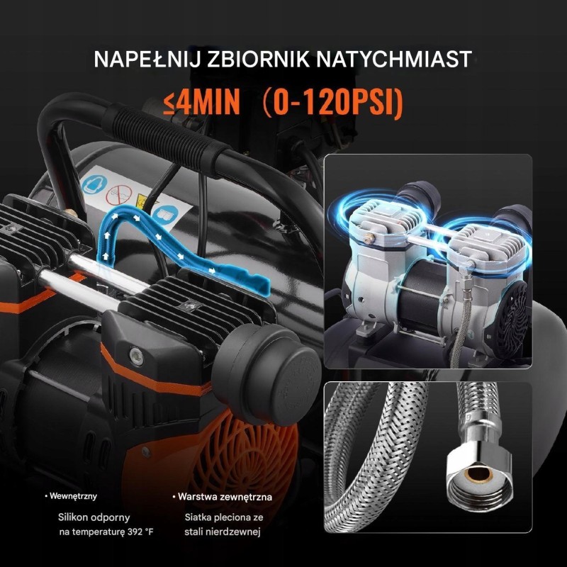 Der ölfreie Luftkompressor nutzt ein spezielles Schlauch- und zylindrisches Luftansaugsystem, das effektiv Zeit und Mühe spart. Der Ansaugschlauch besteht aus hochtemperaturbeständigem Silikon und einem Stahlgeflecht, was doppelten Schutz vor Beschädigungen und Korrosion bietet.