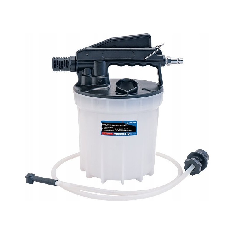 Dieses Gerät ermöglicht den schnellen Wechsel der Bremsflüssigkeit durch eine Person innerhalb weniger Minuten und verhindert so das Risiko einer Luftansammlung im System. Das Gerät wird über die Druckluftanlage betrieben. Dank der Abzugssperre muss das Werkzeug nicht ständig festgehalten werden. Das Werkzeug ist mit einem Geräuschdämpfer für den Betrieb, einem Sicherheitsventil zum Ablassen des Drucks im Behälter sowie einem gegen Bremsflüssigkeit beständigen Silikonschlauch ausgestattet. Der Schlauch ist mit einer Schnellkupplung ausgestattet, die den Anschluss an den Behälter ermöglicht, und am anderen Ende befindet sich ein universeller Gummiadapter, der für den Anschluss an das Bremssystem geeignet ist. Das Gerät eignet sich hervorragend sowohl für professionelle Werkstätten und Autowerkstätten als auch für private Garagen.