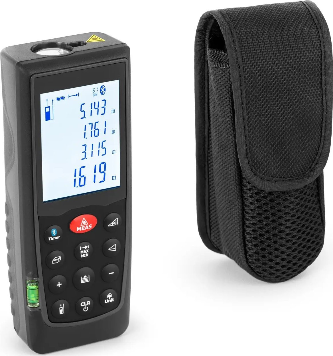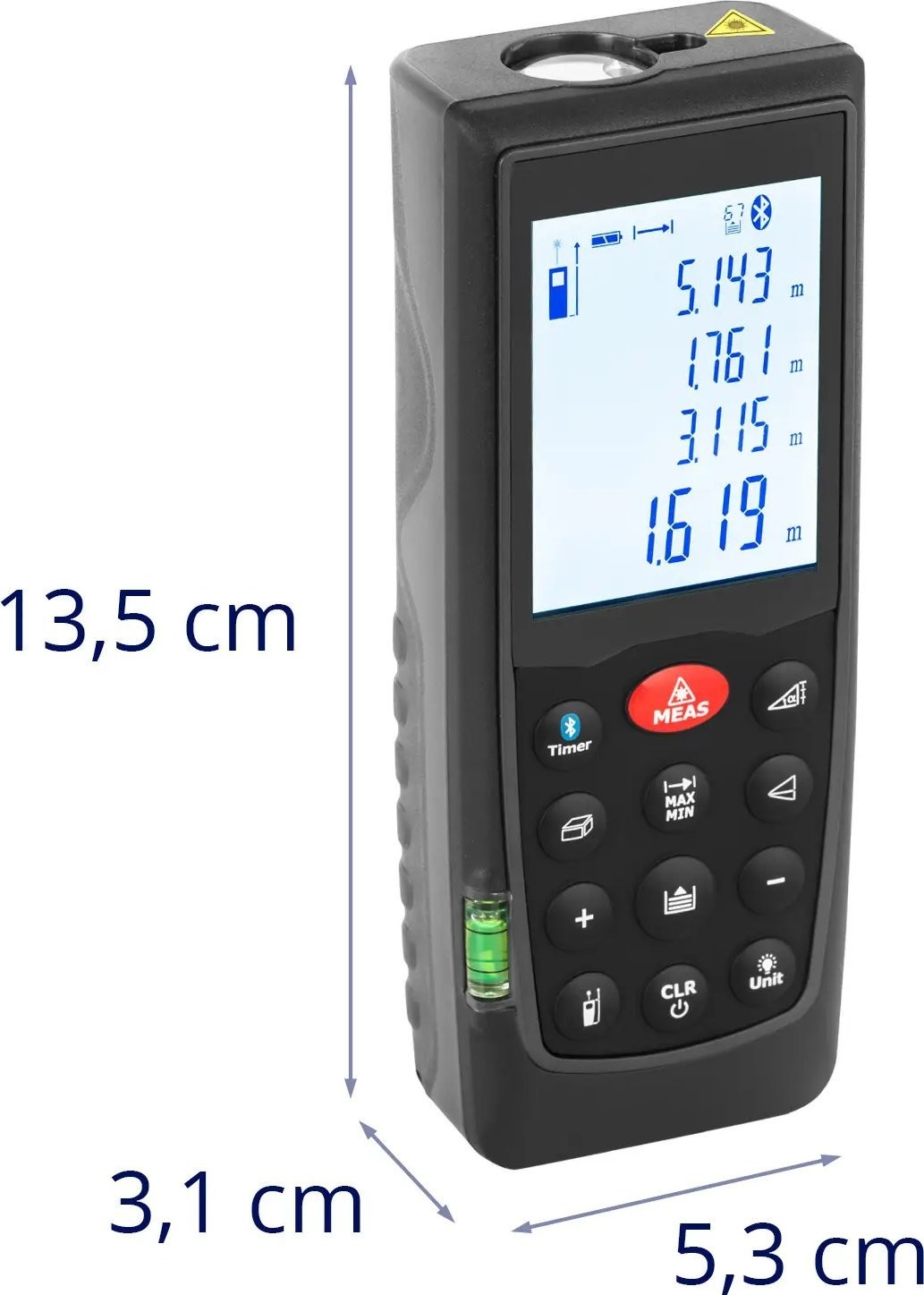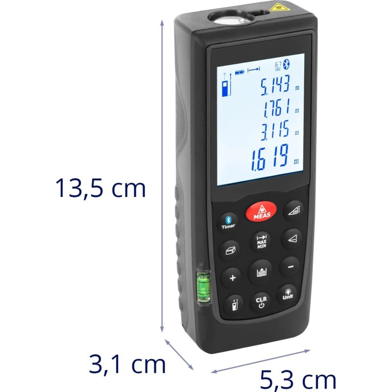 • - Laser-Entfernungsmesser mit einer Genauigkeit von ±1,5 mm und einer Reichweite von 70 m,