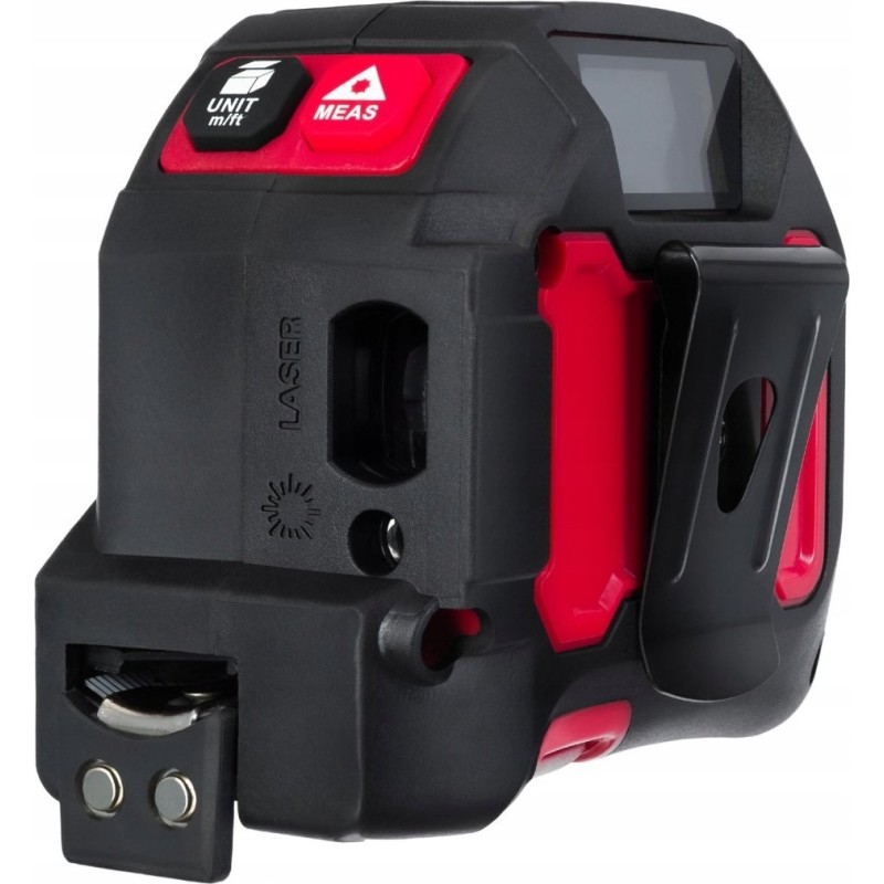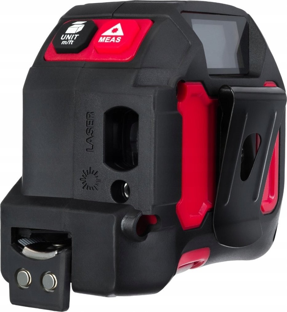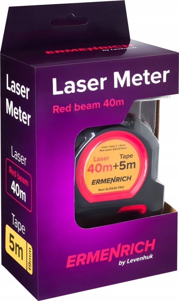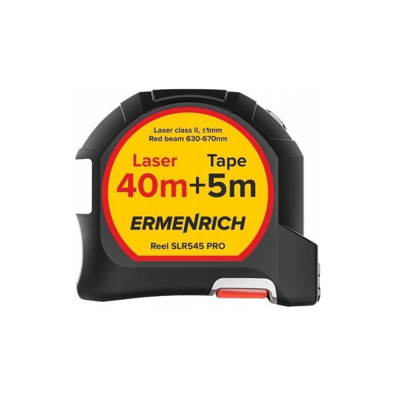 Die Reichweite des Lasers beträgt 40 Meter und ist sowohl in Wohnungen und Häusern in der Stadt als auch auf dem Land nützlich. Das Maßband ist einseitig, hat eine Länge von 5 Metern und ist mit einem Magnethaken ausgestattet. Der Selbstarretierungsmechanismus erleichtert und beschleunigt die Bedienung des Geräts. Das kompakte Gehäuse des Lasermessgeräts Ermenrich Reel SLR545 PRO besteht aus strapazierfähigem ABS-Kunststoff mit einer Gummibeschichtung. Mit der Klammer lässt sich das Lasermessgerät an der Kleidung befestigen, was eine freihändige Bedienung ermöglicht.