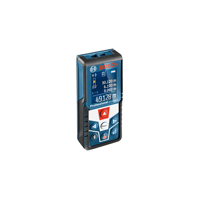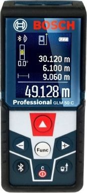 Der Bosch GLM 50 C ist mit einem roten Laser der Klasse 2 mit einer Reichweite von bis zu 50 Metern ausgestattet. Er gewährleistet eine Messgenauigkeit von ± 1,5 mm in weniger als 0,5 Sekunden. Außerdem bietet er die Möglichkeit, den Neigungswinkel des Geräts im Bereich von bis zu 360° mit einer Genauigkeit von ± 0,2° zu messen. In grundlegenden Anwendungsfällen kann er damit eine Wasserwaage ersetzen, ermöglicht aber vor allem die Durchführung komplexer Berechnungen über das Menü.