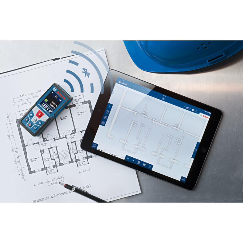 Ein großer Vorteil des Entfernungsmessers GLM 50 C ist zudem die drahtlose Bluetooth-Kommunikation. Die integrierte Schnittstelle ermöglicht die Kommunikation des Geräts mit einem Laptop, Tablet oder Smartphone. In Verbindung mit der kostenlosen Bosch MeasureOn-App können Sie damit Messdaten einfach übertragen und speichern. Die Software GLM floor plan wiederum ermöglicht die Erstellung digitaler Grundrisse sowie deren Import und Bearbeitung, sodass Sie die Fläche eines Raums problemlos messen können.
