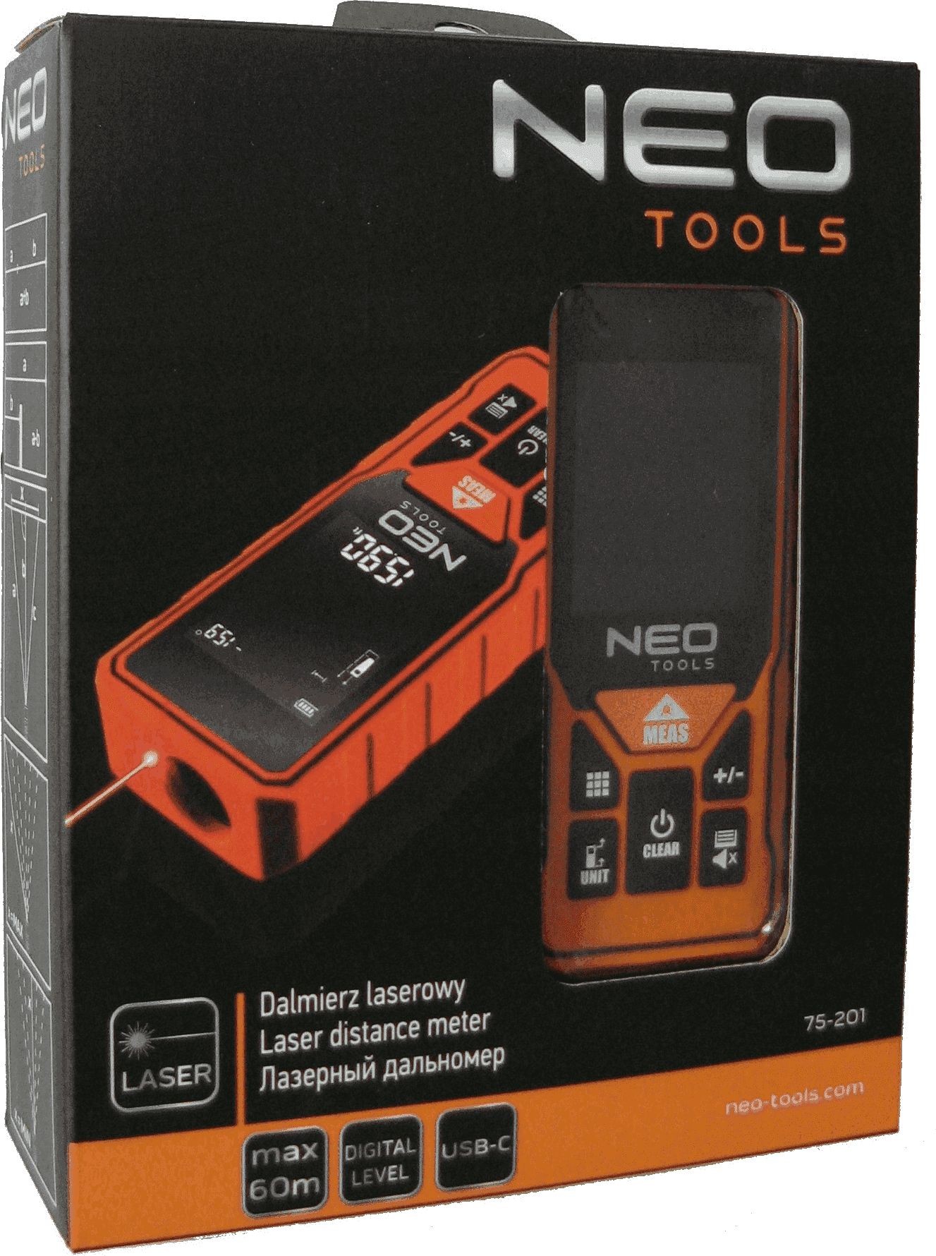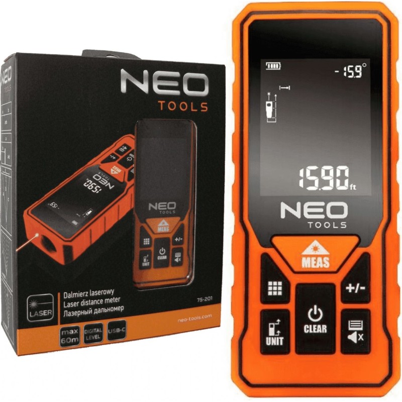 Nach dem Modell 75-203 ist nun der sensationelle NEO-Laser-Entfernungsmesser mit einer Reichweite von 0,2–60 m (75-201) an der Reihe. Die vergrößerte Messreichweite macht ihn zu einem universellen Gerät, das nicht nur für Heimwerker, die selbst Renovierungsarbeiten durchführen, ideal ist. Er kann durchaus zu den Grundwerkzeugen eines Profis, sogar eines Vermessungsingenieurs, gehören und bei Montage-, Technik- und Bauarbeiten eingesetzt werden. Dank des hintergrundbeleuchteten Displays der Messergebnisse ist er einfach zu bedienen.