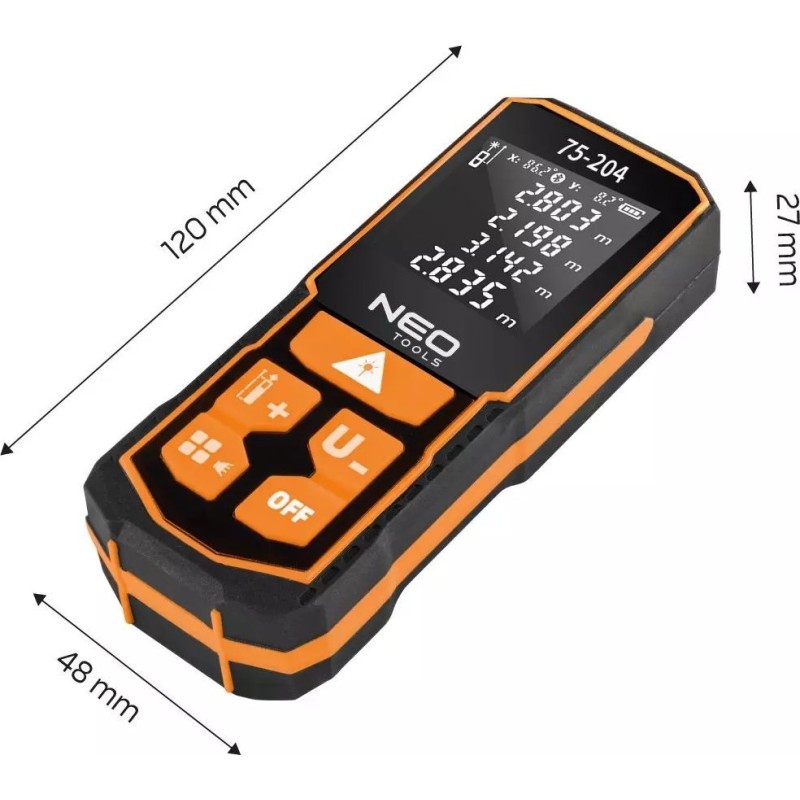 Der Laser-Entfernungsmesser NEO (Art.-Nr. 75-204) mit einer maximalen Reichweite von 60 m ist ein Gerät zur Messung von Entfernungen, Flächen und Volumen. Die Funktionen des Entfernungsmessers ermöglichen zudem indirekte Messungen (mithilfe des Satzes des Pythagoras), fortlaufende Messungen, Addition und Subtraktion sowie Maximal- und Minimalmessungen. Die Messung kann vom Anfang, der Mitte und vom Ende des Geräts aus sowie in drei Maßeinheiten erfolgen: m/in/ft. Zusätzlich ist das Gerät mit einer automatischen Wasserwaage ausgestattet, die es ermöglicht, den Neigungswinkel des Entfernungsmessers laufend abzulesen. Es verfügt über einen Speicher für die letzten 30 Messungen. Die Messgenauigkeit beträgt +/- 2 mm. Das Gerät verfügt über die Schutzklasse IP54 und ein CE-Zertifikat. Der Entfernungsmesser ist mit einer einstellbaren Lautstärke ausgestattet. Er wird mit zwei AA-NiMH-Akkus oder zwei AA-Alkalibatterien betrieben. Im Lieferumfang enthalten sind ein USB-C-Ladekabel und ein Handgelenkband.