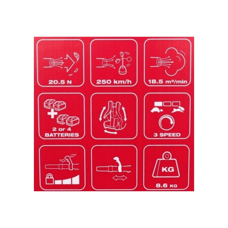 Für den Komfort des Benutzers ist das Gebläse mit bequemen, verstellbaren, gepolsterten Schultergurten und einer Rückenpolsterung ausgestattet.