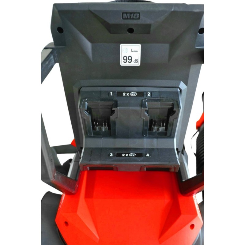 Das Akku-Blasgerät wird mit zwei M18-Akkus betrieben (Platz für bis zu 4 Akkus).