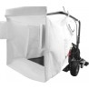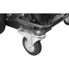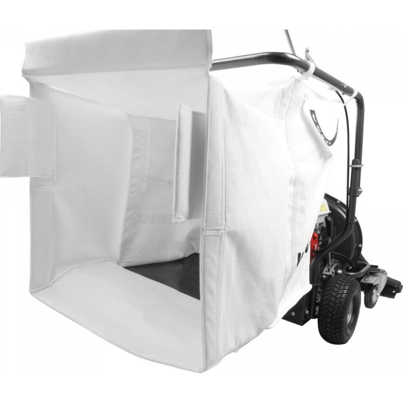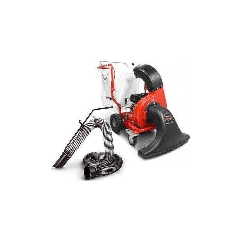 Der Antrieb wird auf die gepumpten Hinterräder übertragen. Dadurch bewältigt der Bediener mühelos Steigungen, schlammiges Gelände und Unebenheiten und spart dabei Energie. An der Vorderseite sind zwei Lenkrollen angebracht, dank derer der Sauger während der Arbeit stabil fährt und nicht zur Seite kippt, was besonders bei Arbeiten auf unebenem Untergrund wichtig ist. Die Arbeitshöhe lässt sich über einen Hebel einstellen. Damit kann die Höhe des Saugtrichters passend zum Untergrund angepasst werden. Das Manövrieren in Ecken und um Bäume herum ist einfach und bequem. Das Gerät wird von einem hervorragenden, bewährten Motor der Marke Loncin G160F angetrieben. Dieser Motor ist zuverlässig und dank allgemein erhältlicher Ersatzteile kostengünstig im Betrieb.