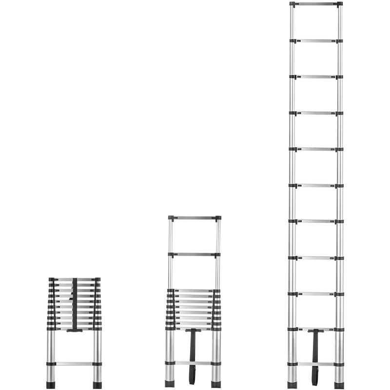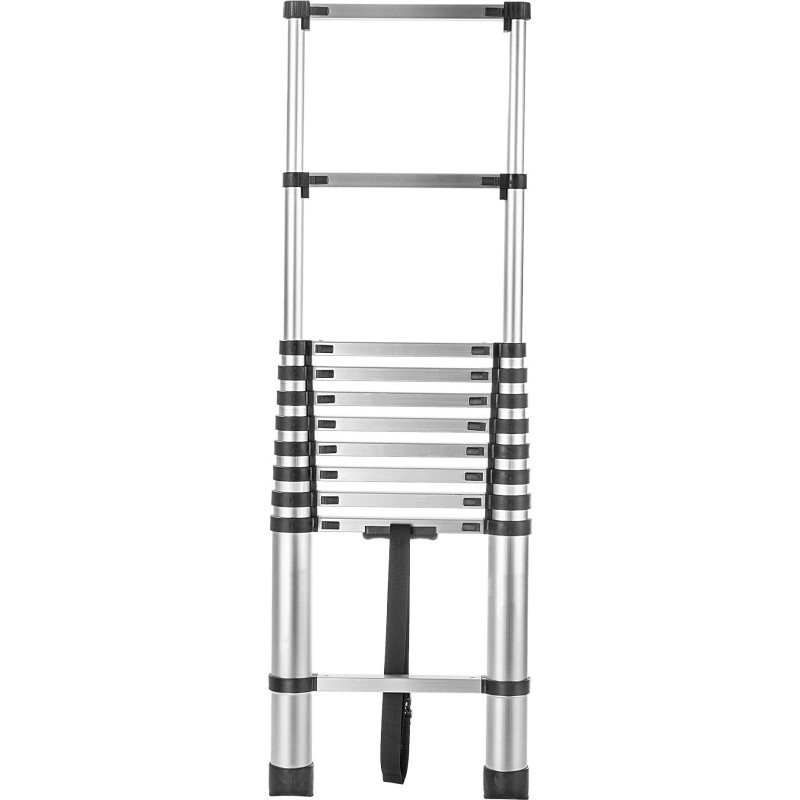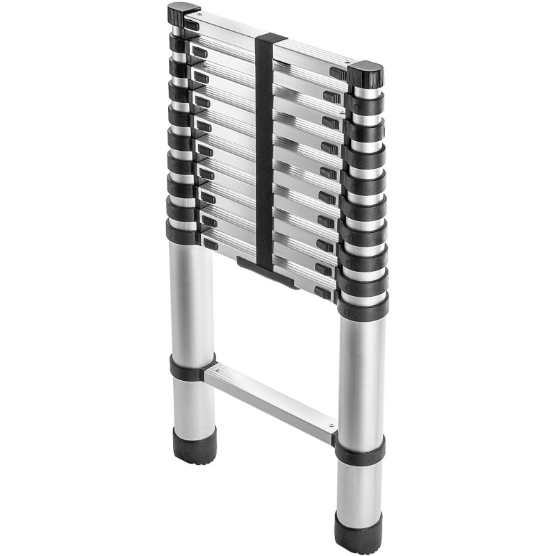 Die Zalavar-Teleskopleiter wurde aus strapazierfähigem und zugleich leichtem Aluminium in stilvoller silberner Farbe gefertigt. Dank der Eigenschaften des ausgewählten Materials bleibt das Gewicht des Produkts so gering, dass Sie keine Schwierigkeiten bei der Lagerung, dem Umstellen oder dem Transport haben werden. Letzteres wird zusätzlich durch einen speziellen Gurt erleichtert – befestigen Sie ihn einfach um die Leiter, um ein ungewolltes Aufklappen der Konstruktion während des Transports zu verhindern. Setzen Sie auf Sicherheit und Funktionalität – entscheiden Sie sich für die Zalavar-Leiter!