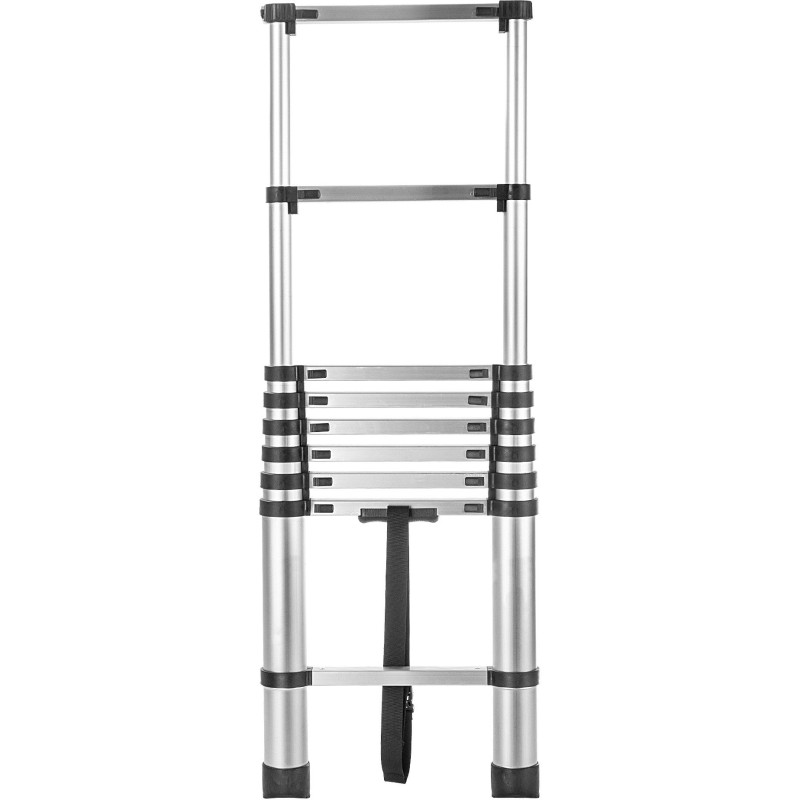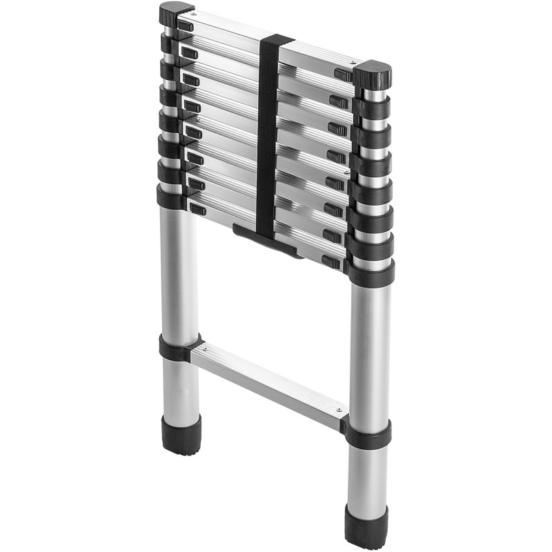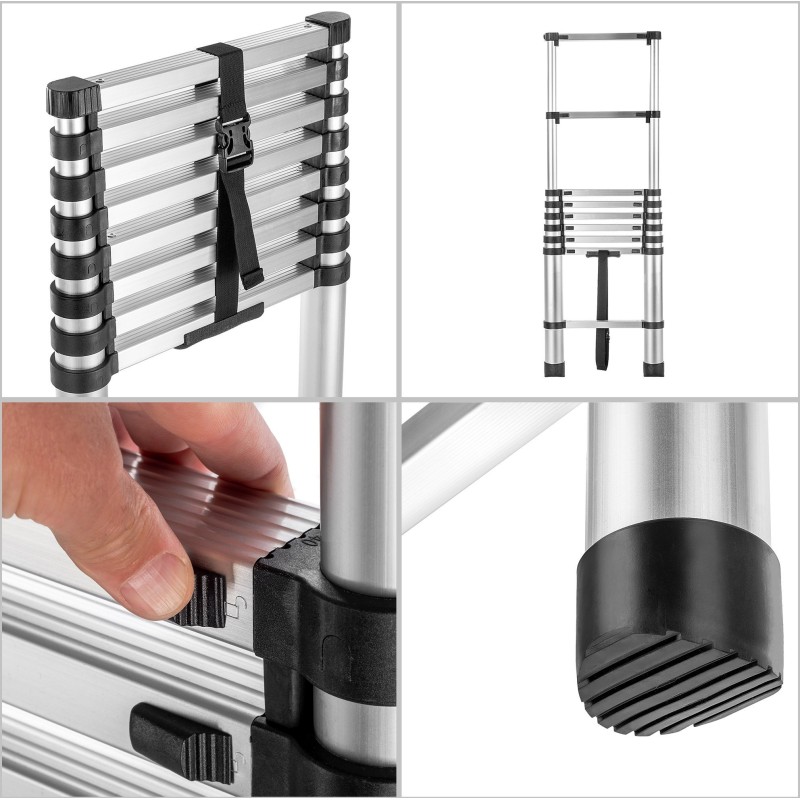 Die Zalavar-Teleskopleiter wurde aus strapazierfähigem und zugleich leichtem Aluminium in stilvoller silberner Farbe gefertigt. Dank der Eigenschaften des ausgewählten Materials bleibt das Gewicht des Produkts so gering, dass Sie keine Schwierigkeiten bei der Lagerung, dem Umstellen oder dem Transport haben werden. Letzteres wird zusätzlich durch einen speziellen Gurt erleichtert – befestigen Sie ihn einfach um die Leiter, um ein ungewolltes Aufklappen der Konstruktion während des Transports zu verhindern. Setzen Sie auf Sicherheit und Funktionalität – entscheiden Sie sich für die Zalavar-Leiter!